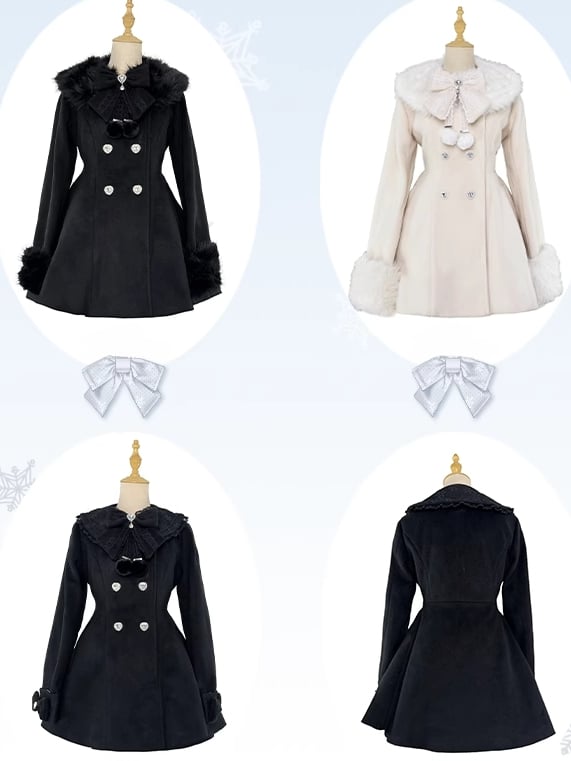 ジライケイ ベージュ 取り外し可能なプラッシュカラーとカフス 地雷風 リボン付きウールコート