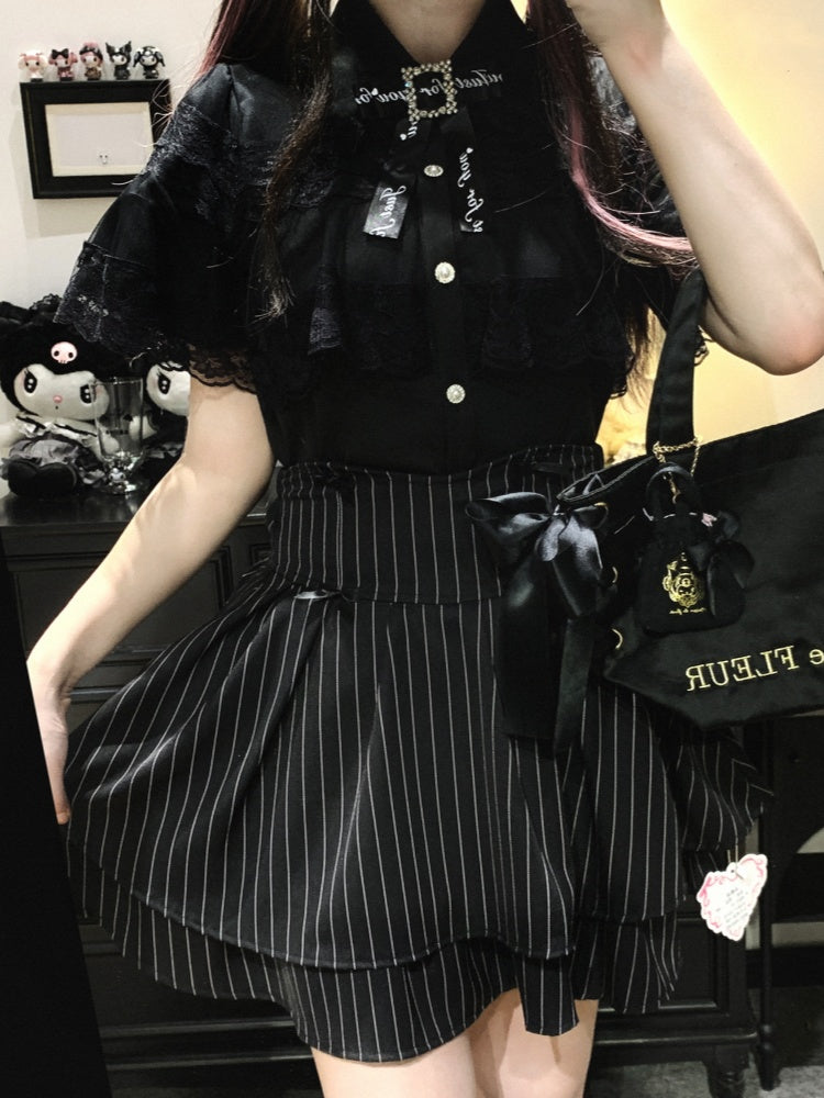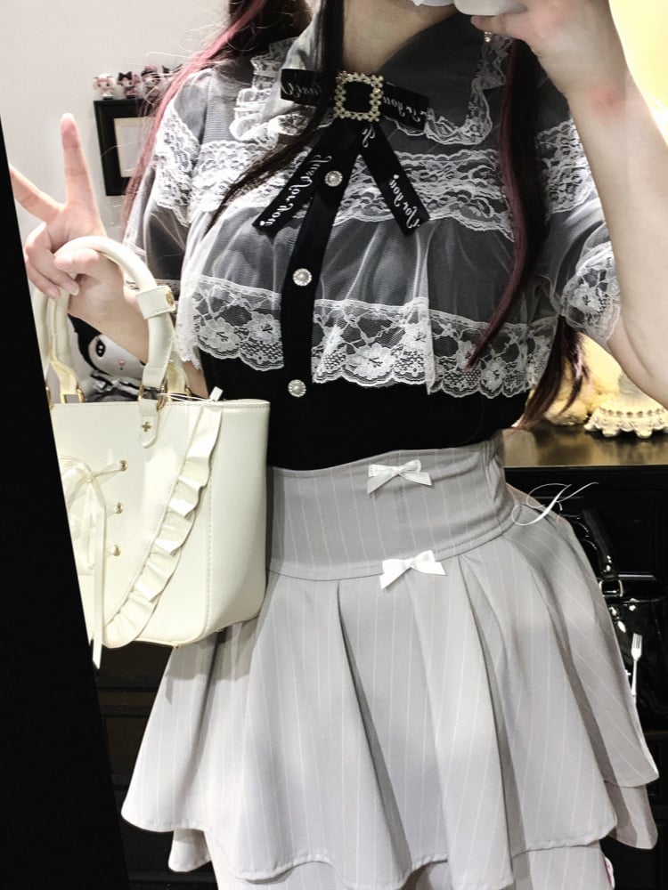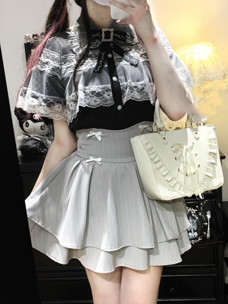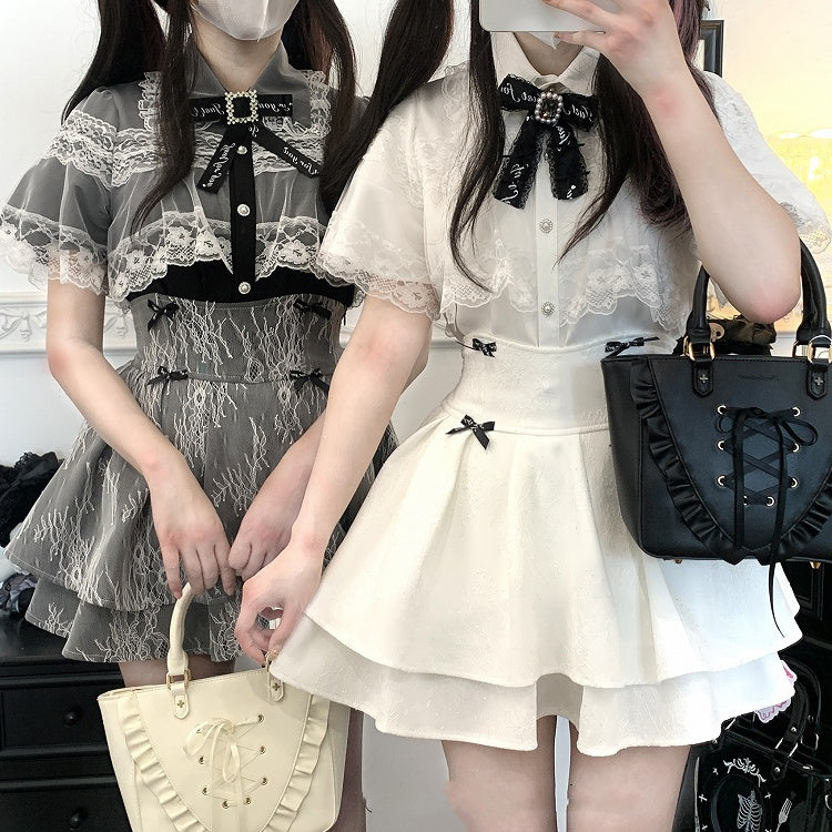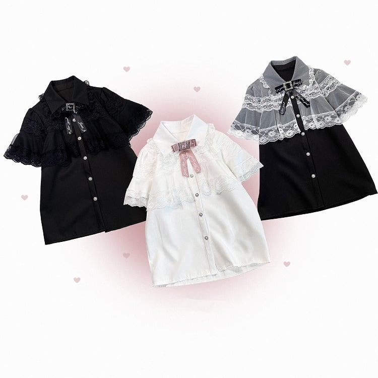 ジライケイ ブラック/ホワイト/ブラック&ホワイト レースケープデザイン 半袖ブラウス