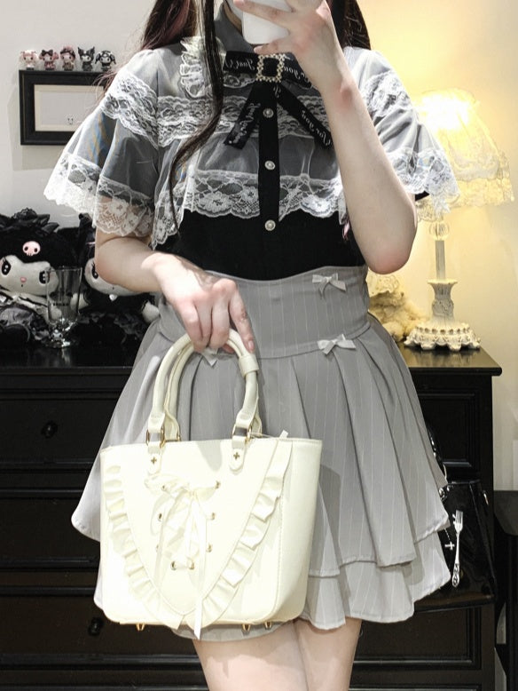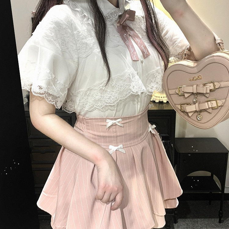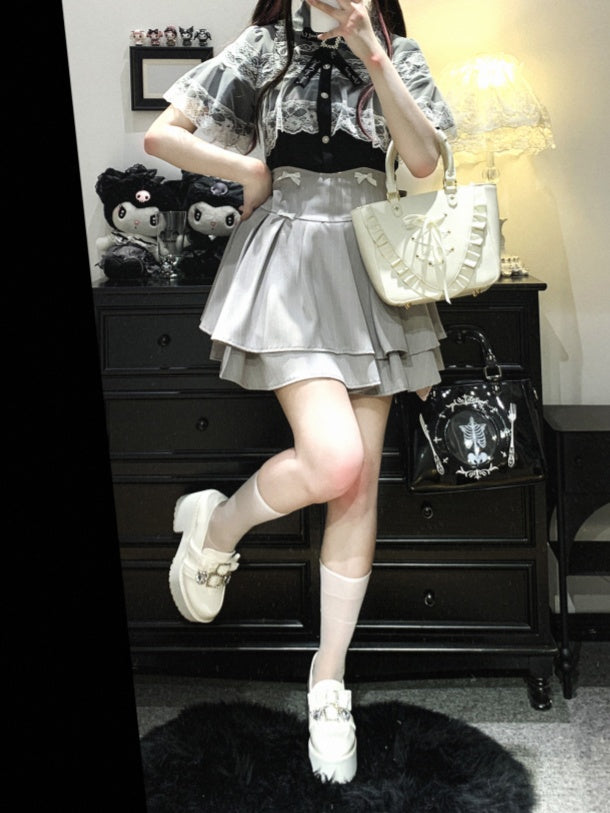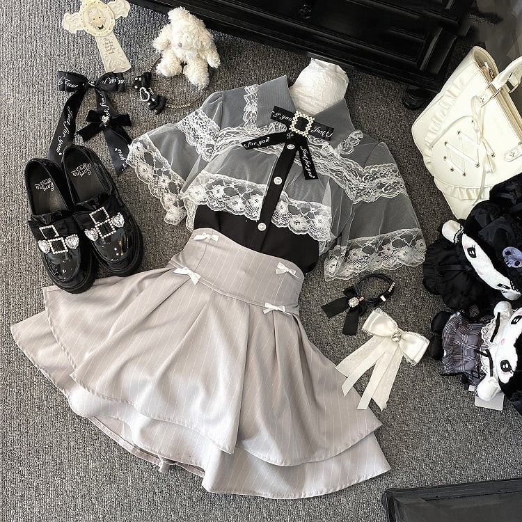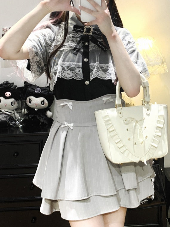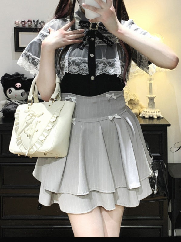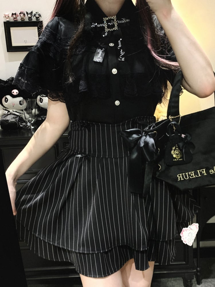 ジライケイ ブラック/ホワイト/ブラック&ホワイト レースケープデザイン 半袖ブラウス