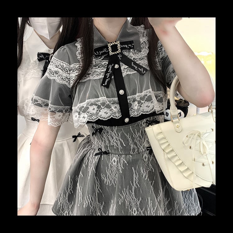 ジライケイ ブラック/ホワイト/ブラックホワイト レースケープデザイン 半袖ブラウス