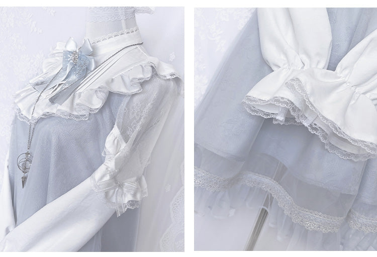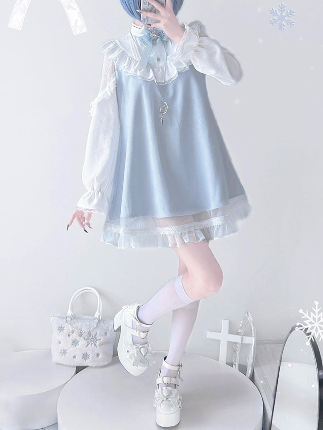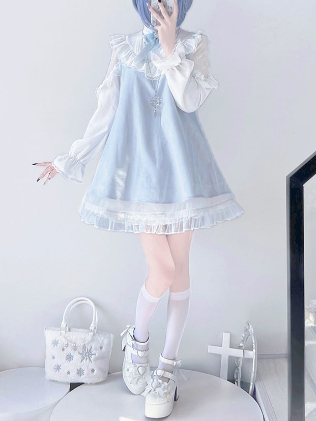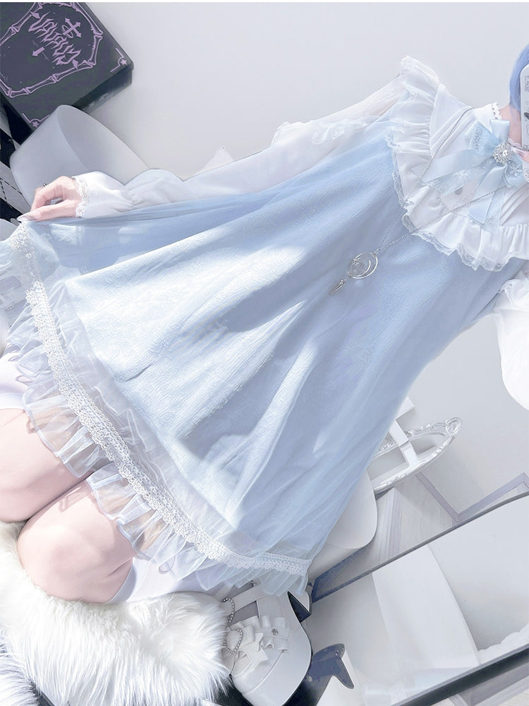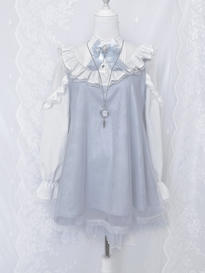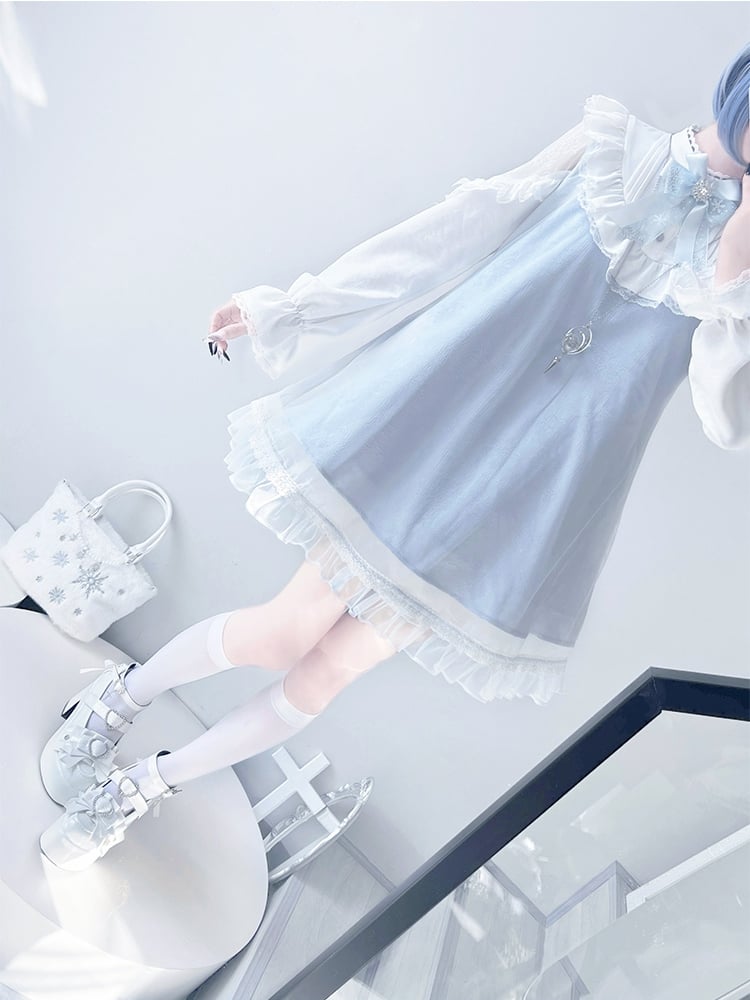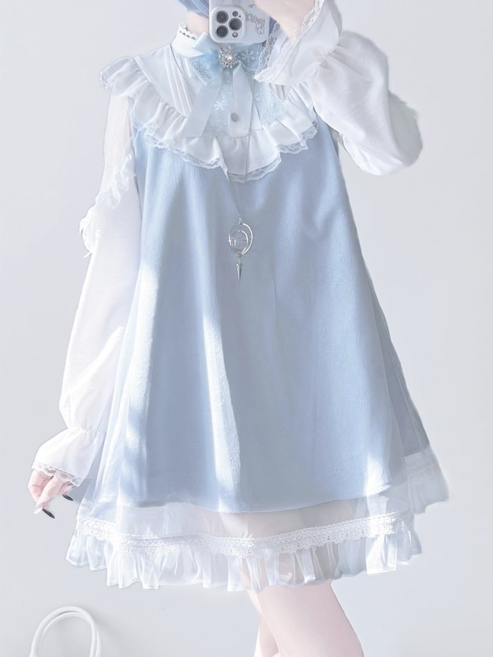 繊細なレースパッチの肩と、ユニークな地雷風デザインが特徴の、愛らしいライトブルーのドレス。レーストリムの長袖は、どんなシーンにもぴったり。Jirai Kei Dressで、ワードローブにキュートなアクセントをプラスして。
