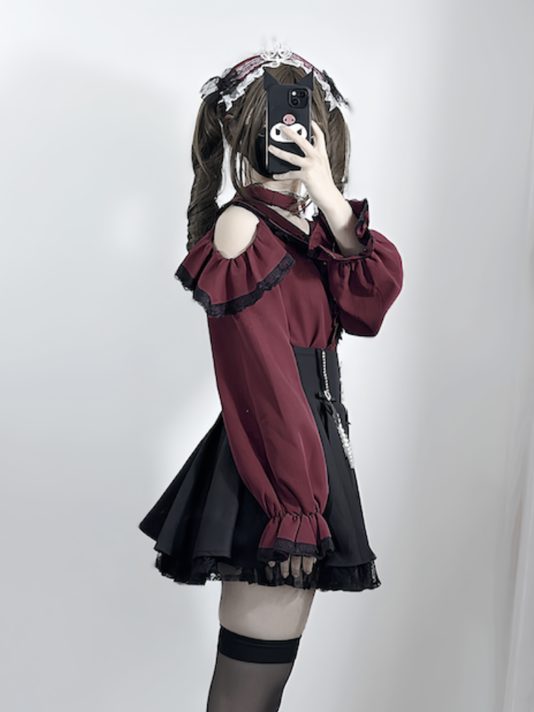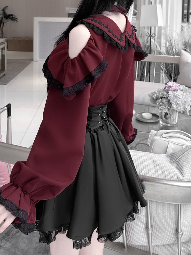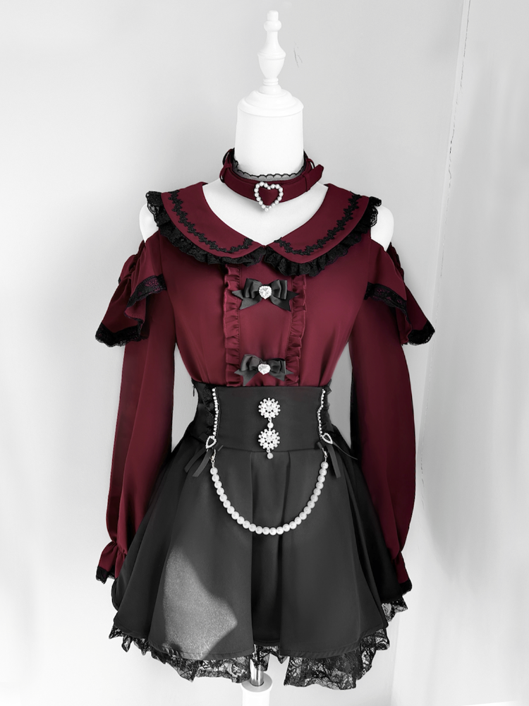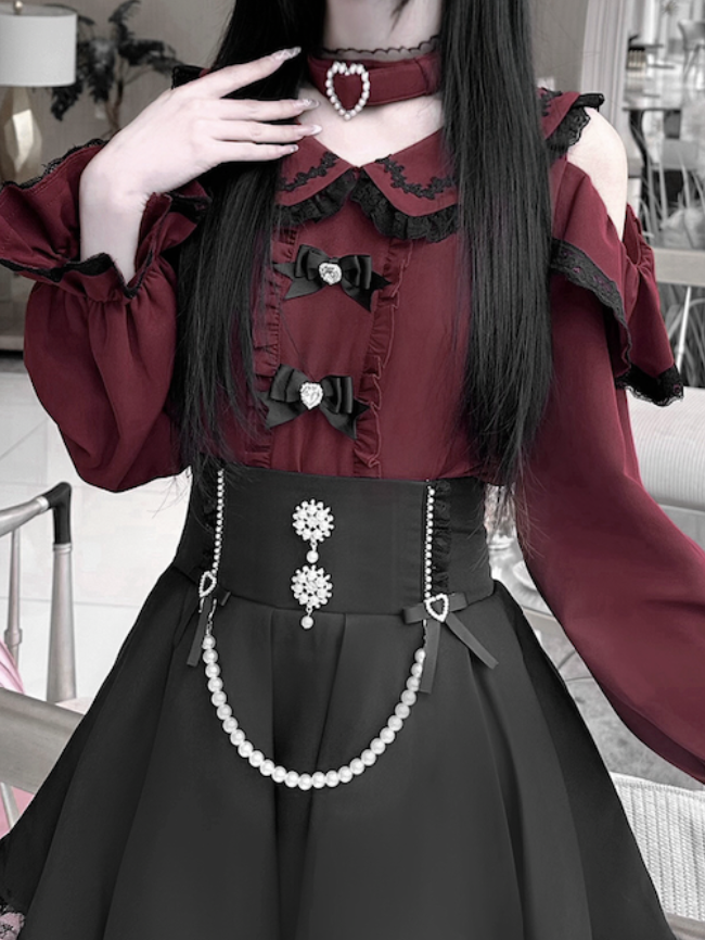 ジライケイ ピーターパンカラー カットアウトショルダー コントラストブラックレーストリム ワインレッドブラウス 取り外し可能なチョーカーデザイン
