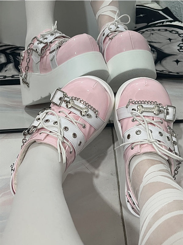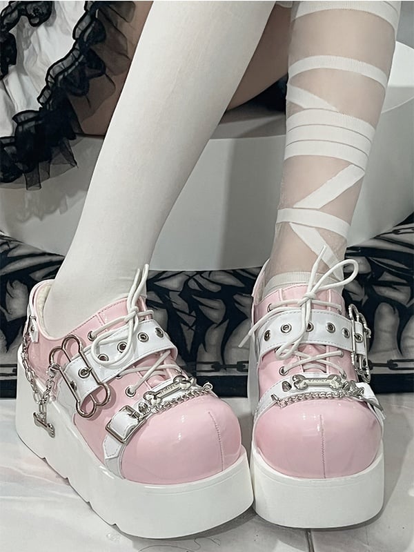 Jirai Kei ピンク Y2K ボーン デザイン バックル ストラップ プラットフォーム シューズ