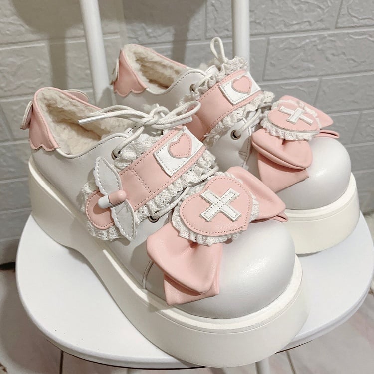 Jirai Kei ピンク Yami Kawaii クロスちょう結びレースアップディテールプラットフォームシューズ