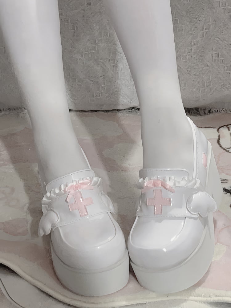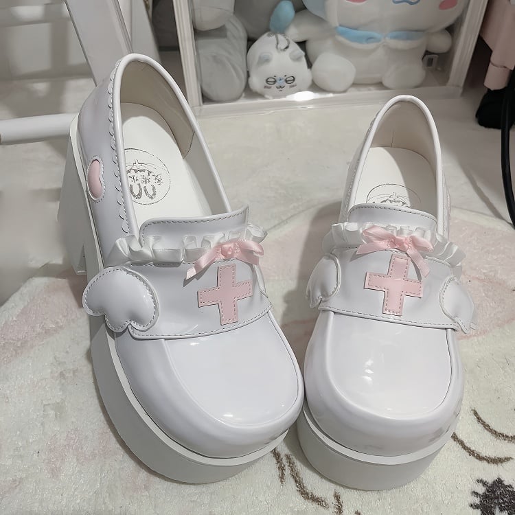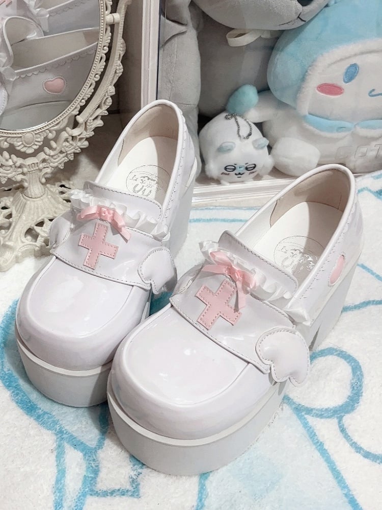 可愛らしさとダークさが絶妙に融合した、Jirai Kei Pink Yami Kawaii Cross Bowknot プラットフォームローファー。クロスボウノットデザインと高さをプラスするプラットフォームソールが特徴のローファースタイルで、個性的なスタイルを演出できます。