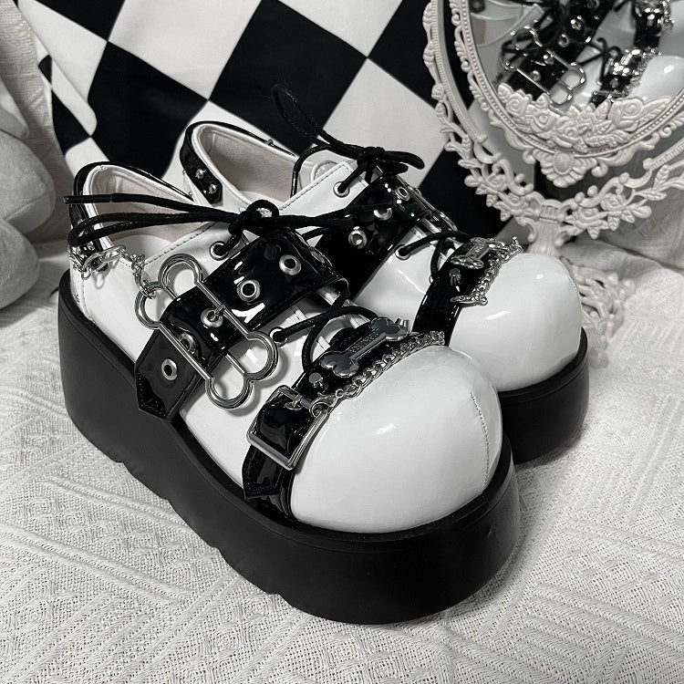 Jirai Keiのポリッシュ仕上げのホワイト&ブラックY2Kボーンバックルストラッププラットフォームシューズは、コーディネートにキュートなアクセントを添えます。ボーンバックルストラップのデザインは、全体のスタイルを引き立てるだけでなく、快適なサポート力も提供します。この可愛らしくファッショナブルなシューズで、スタイルをワンランクアップさせましょう。