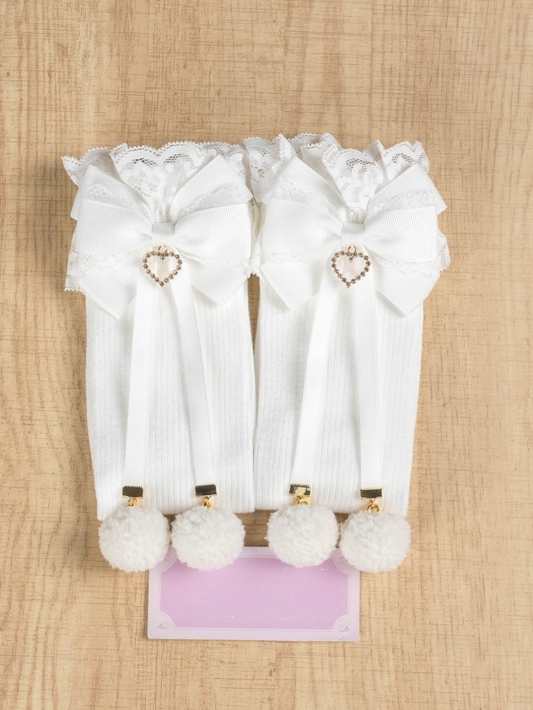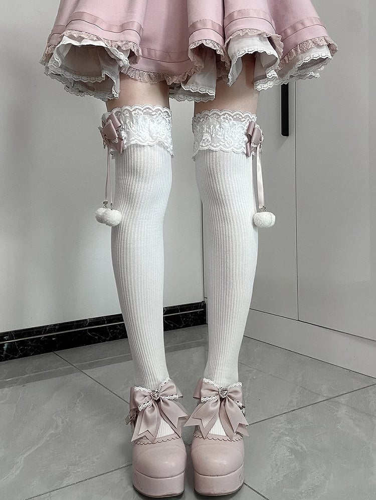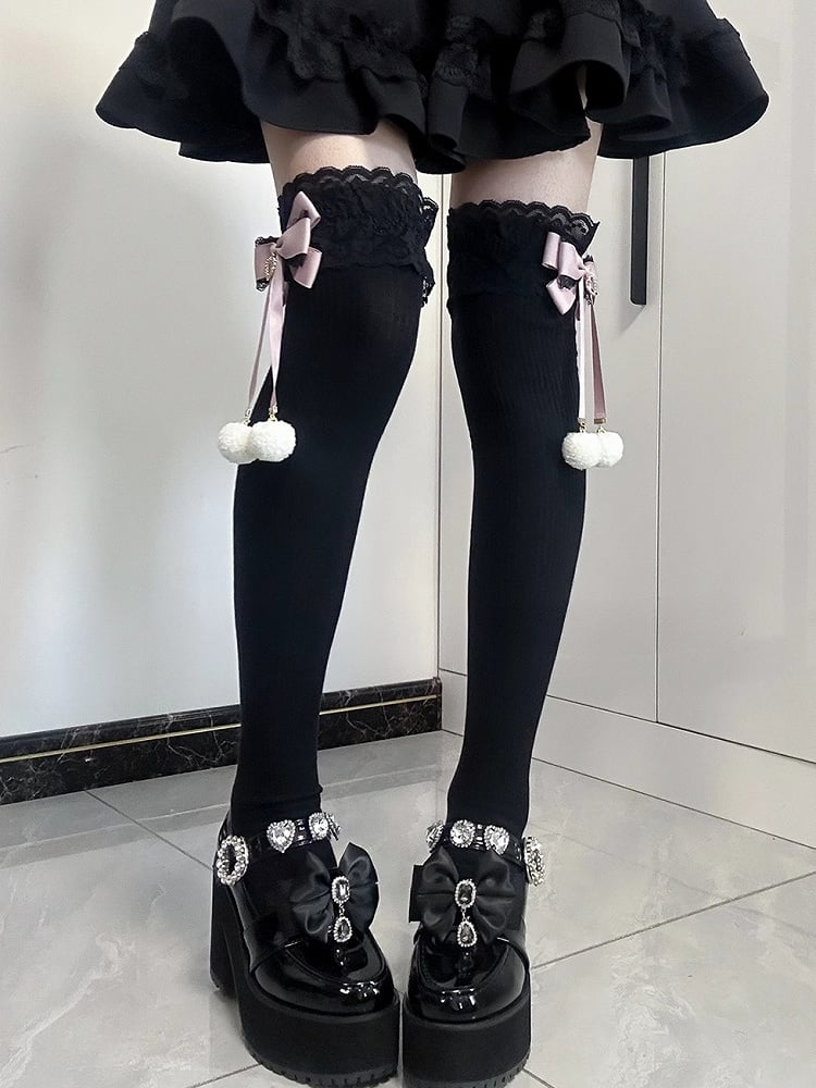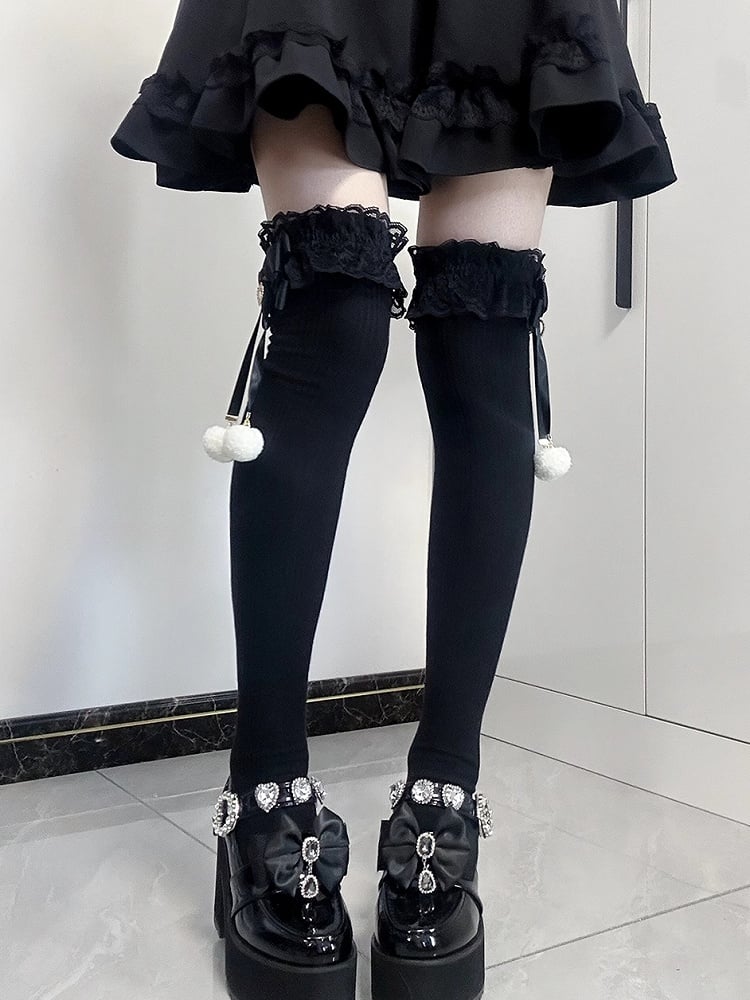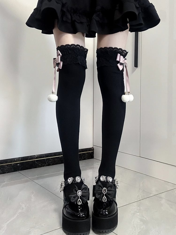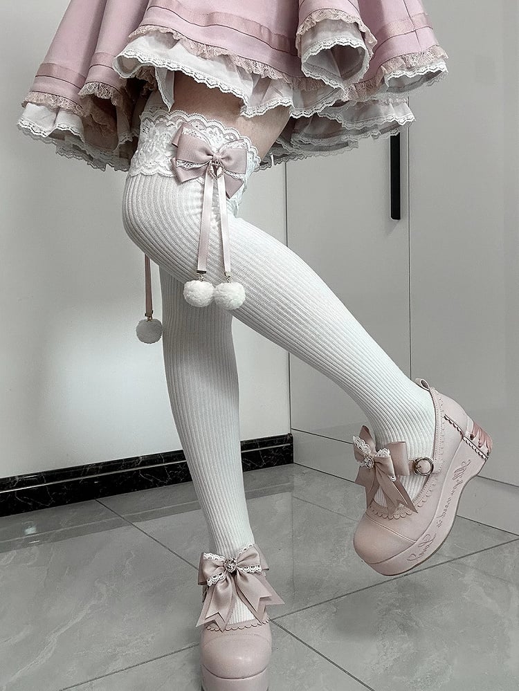 ジライケイ ポンポンディテール レースカフス 蝶結び オーバーニーストッキング