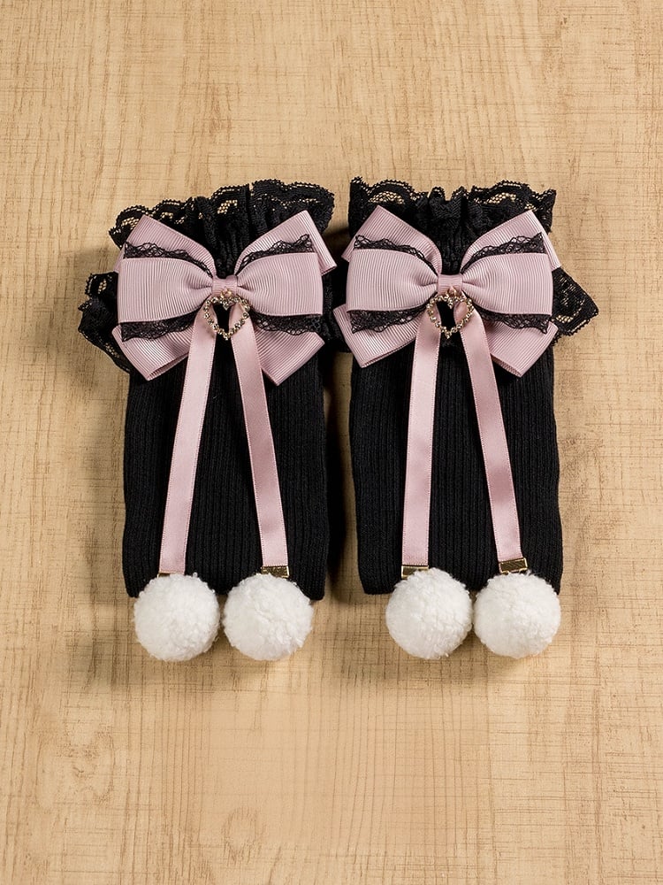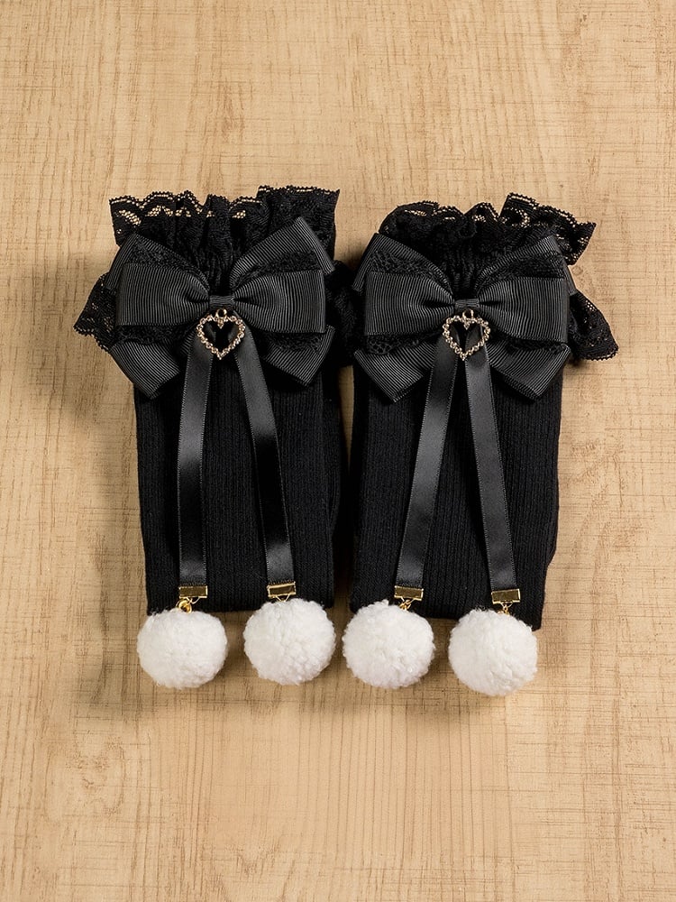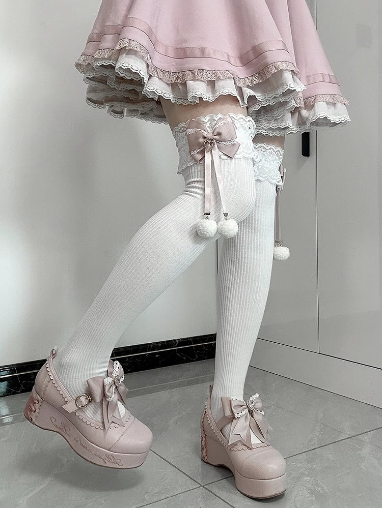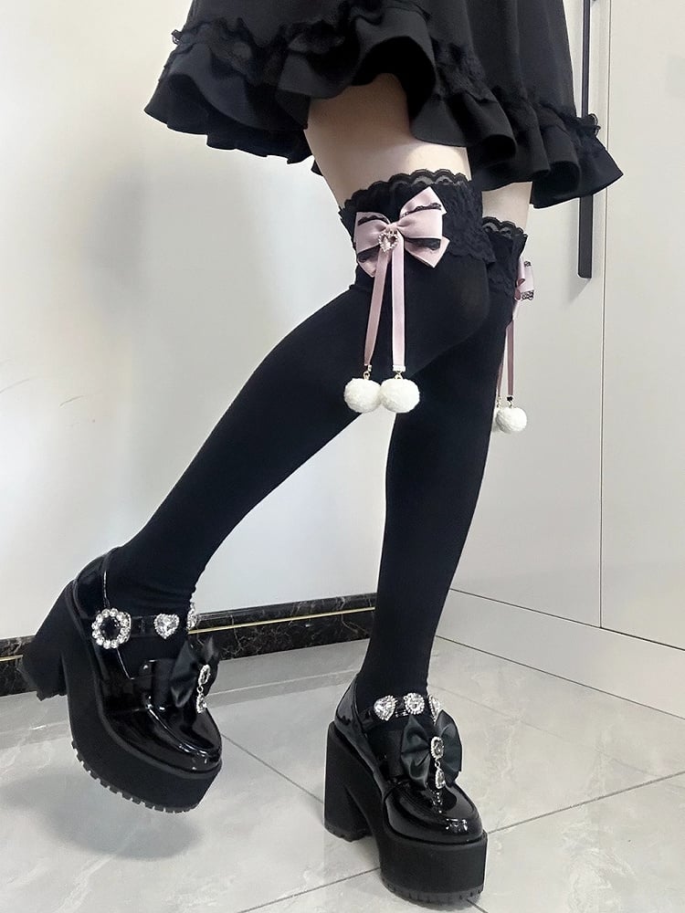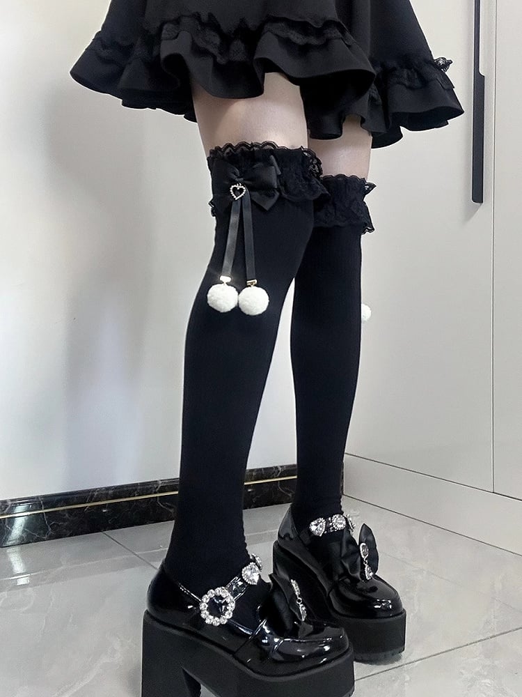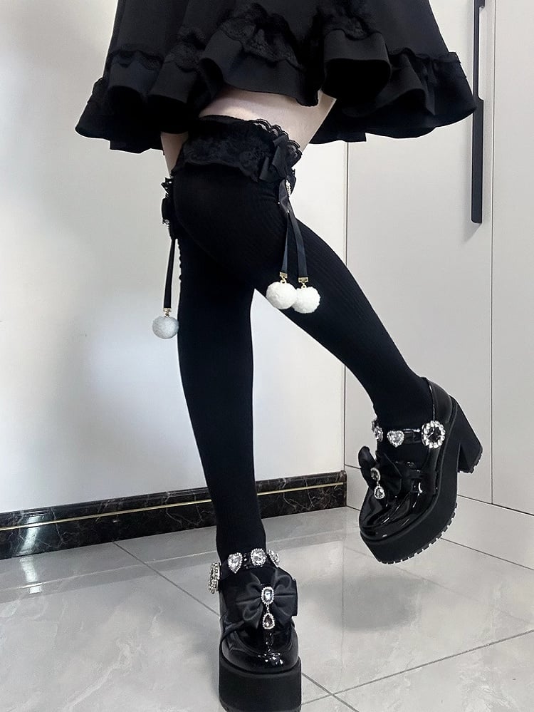 ジライケイ ポンポンディテール レースカフス 蝶結び オーバーニーストッキング