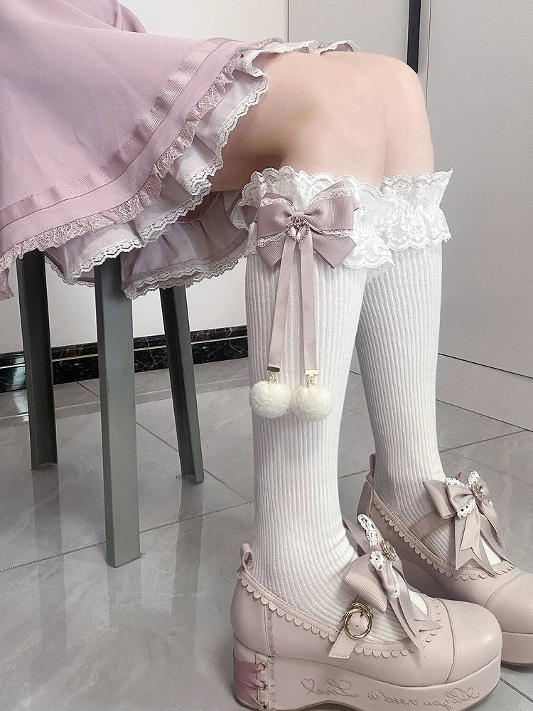 ジライケイ ポンポンディテール レースカフス 蝶結び 膝下ストッキング