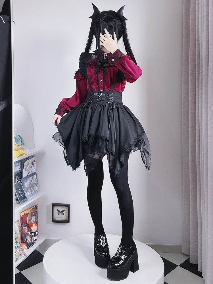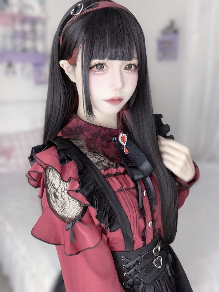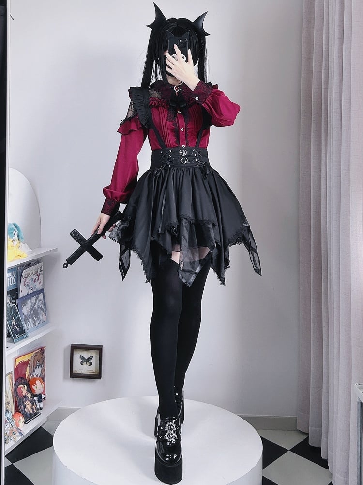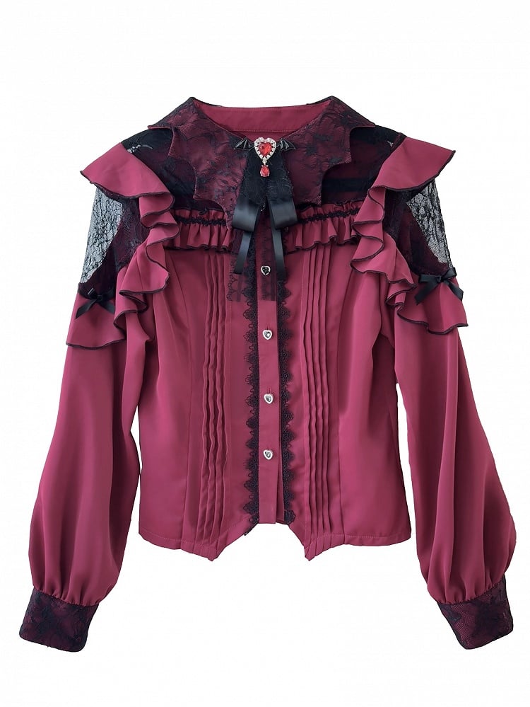 ジライケイ ワインレッド コウモリの羽根型襟 レースパッチ 地雷風シャツ