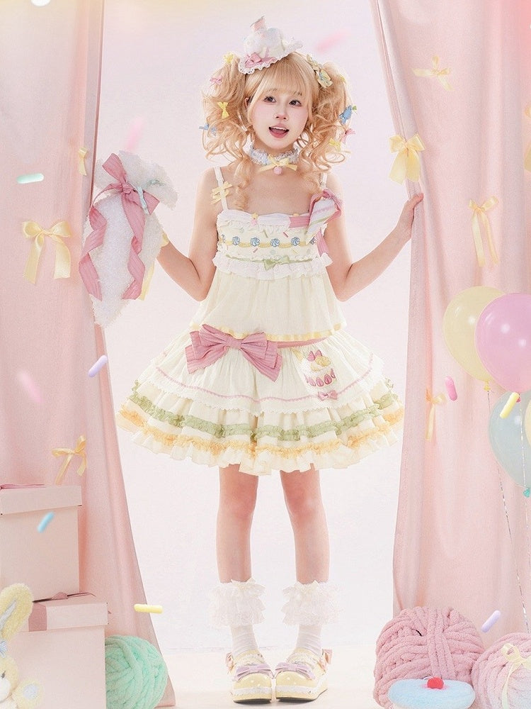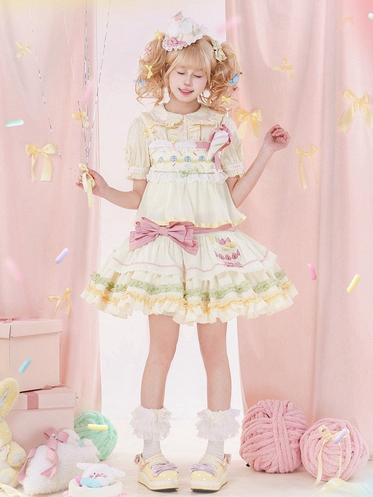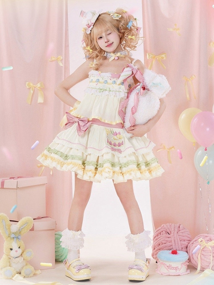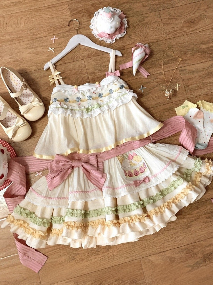 パステルカラーのストロベリークリームケーキ刺繍のサマースイートロリータジャンパースカート