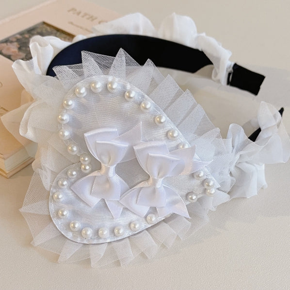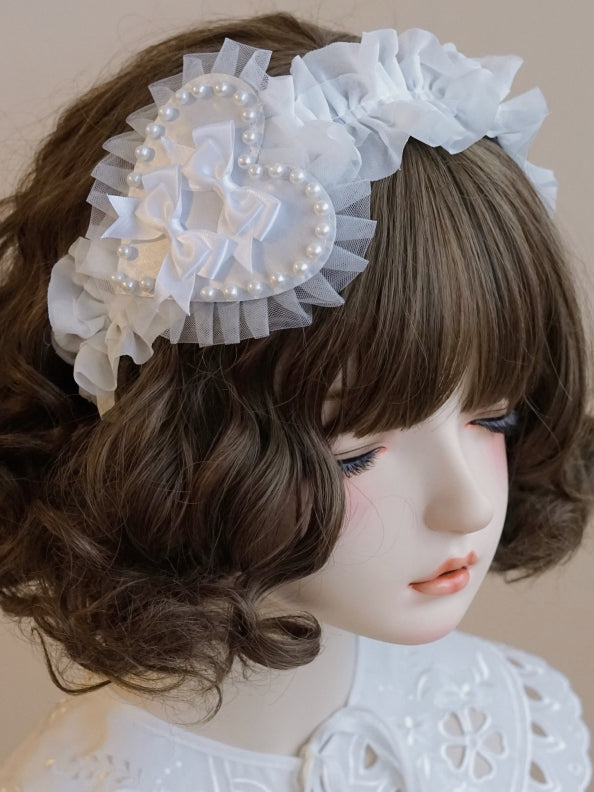 ホワイトの蝶結びのディテール、ビーズで飾られたレースのトリム、ハートKC