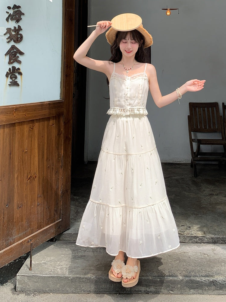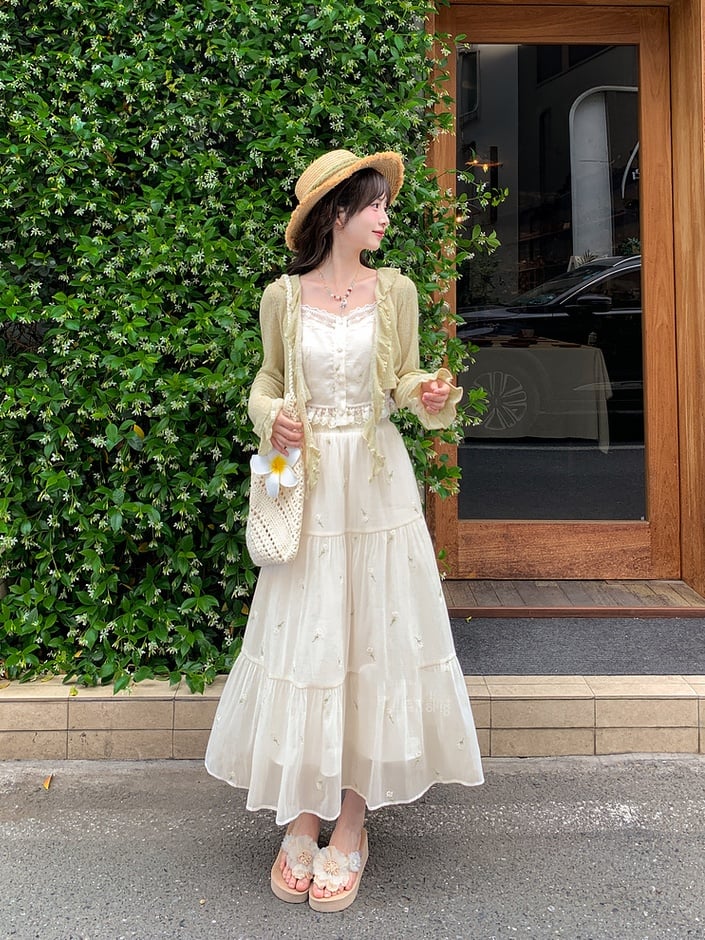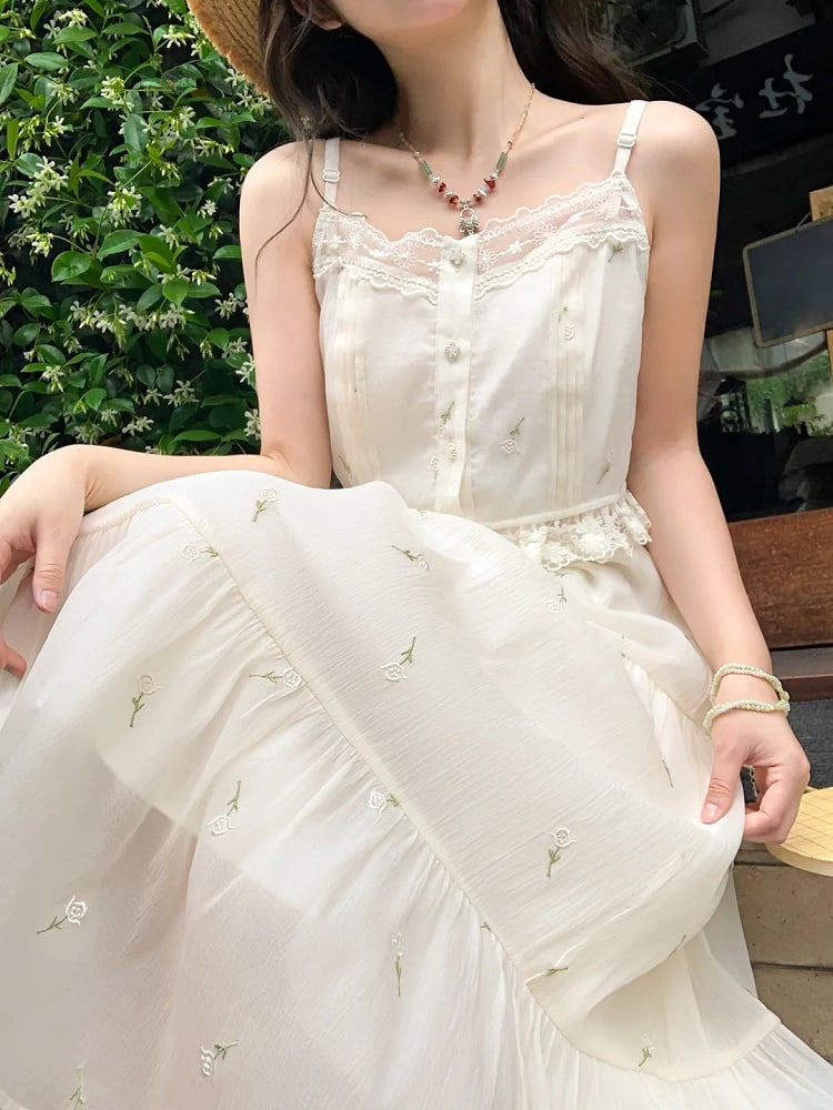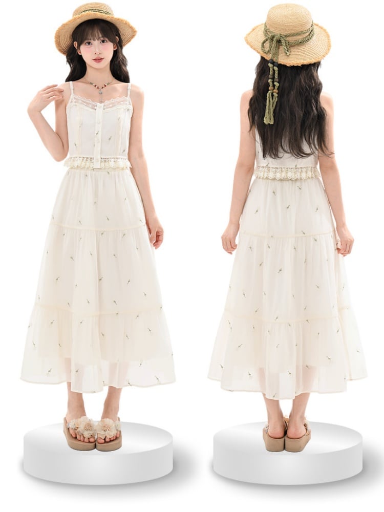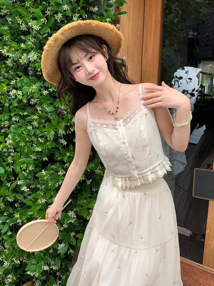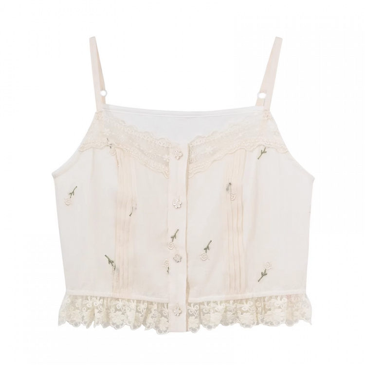 Kei Buttons ベージュ フローラル刺繍 レーストリム フローラル モリ キャミトップ