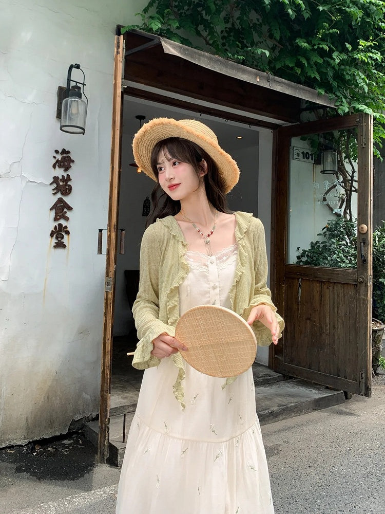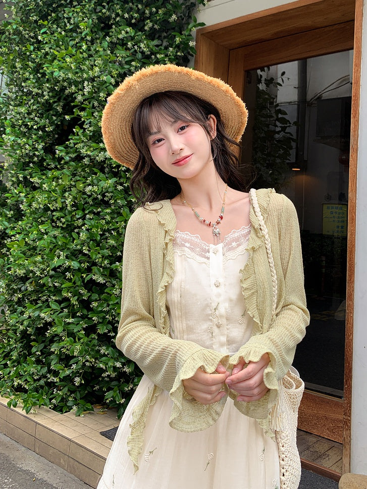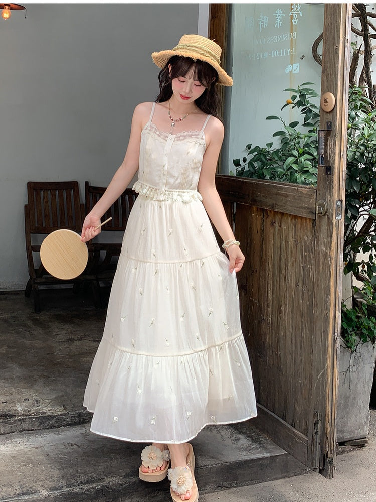 ベージュの花柄刺繍レーストリム花柄ボタンMori Keiキャミソールトップス