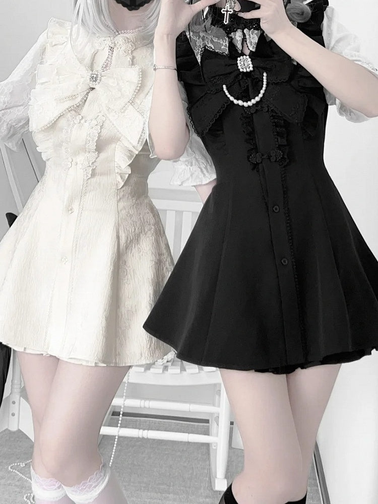 Y2K ブラック ジライケイ セット - チャイナカラー 半袖 ドレス + ショートパンツ + 蝶ネクタイ + ヘアクリップ