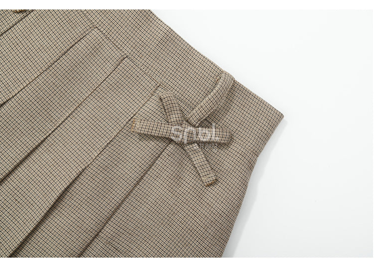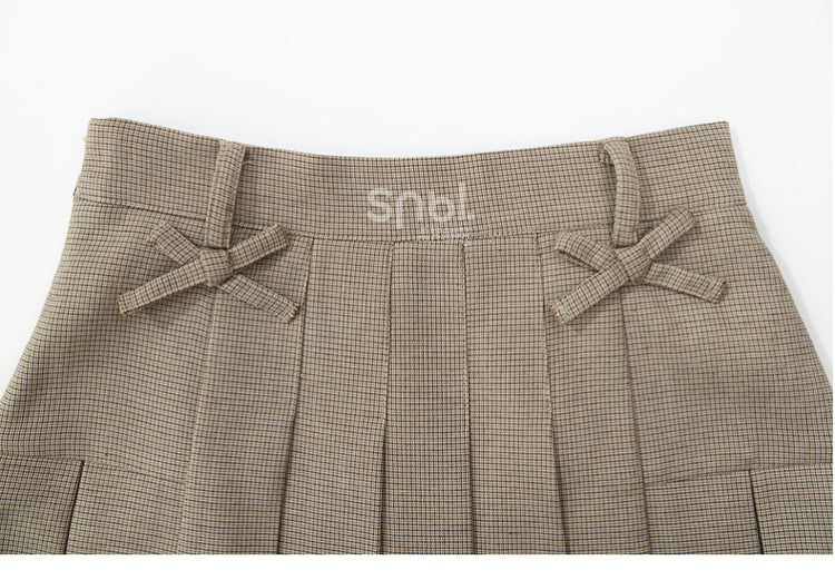 カーキ色のリボンアクセントのチェック柄プリーツスカート