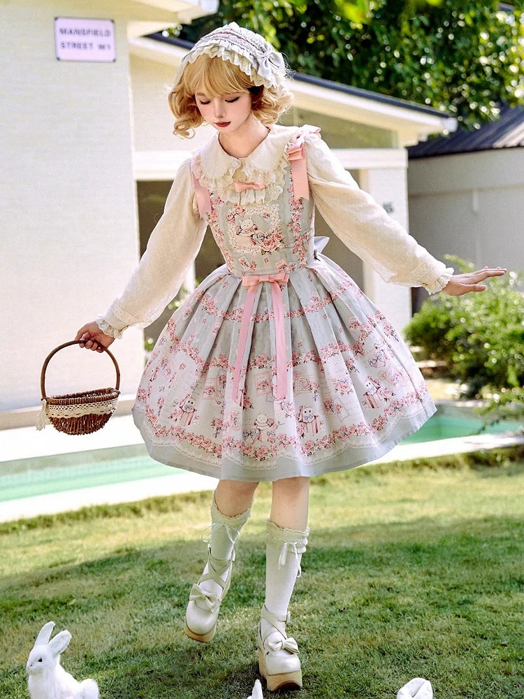 愛らしいグリーンの背景に、キュートな猫と花柄がプリントされた、甘さ控えめのロリータジャンパースカート。ワードローブに愛らしさをプラスするのにぴったりです。