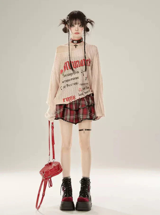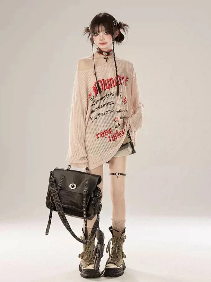 遊び心のあるプリントとオフショルダーデザインがキュートな、アプリコットニットTシャツ。ゆったりとしたトップスで、快適でスタイリッシュな着こなしをお楽しみください。