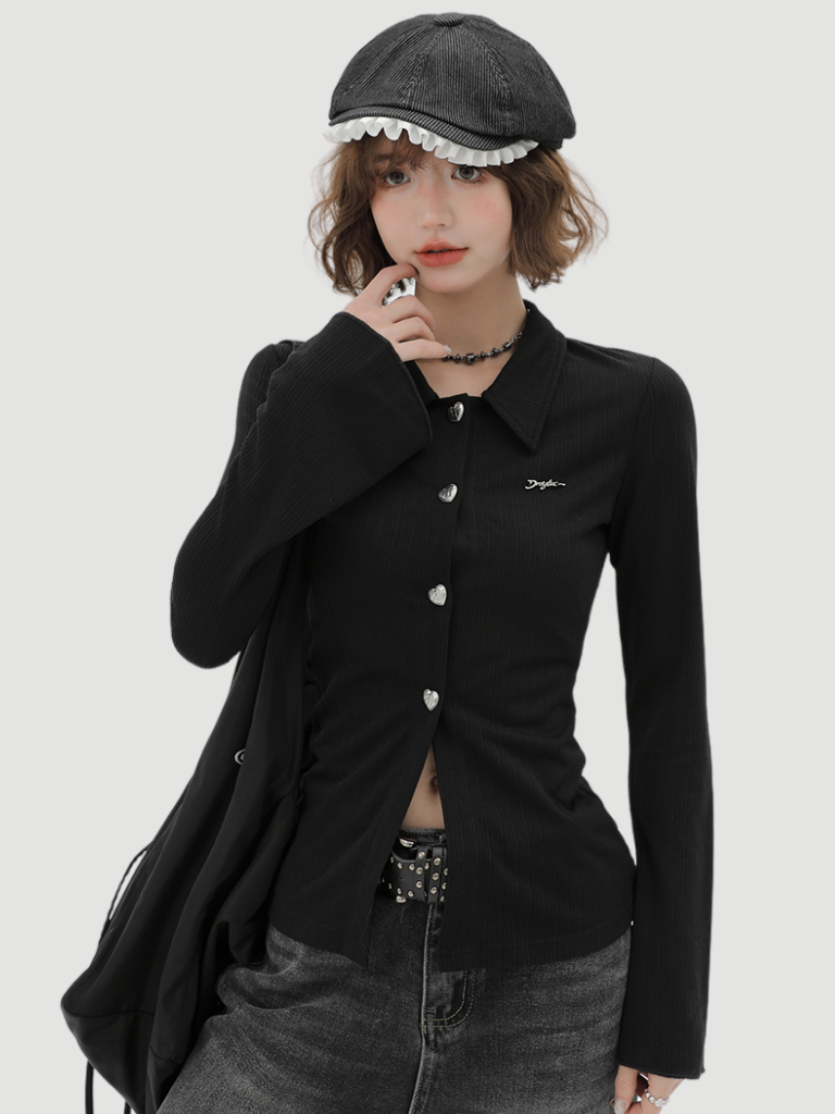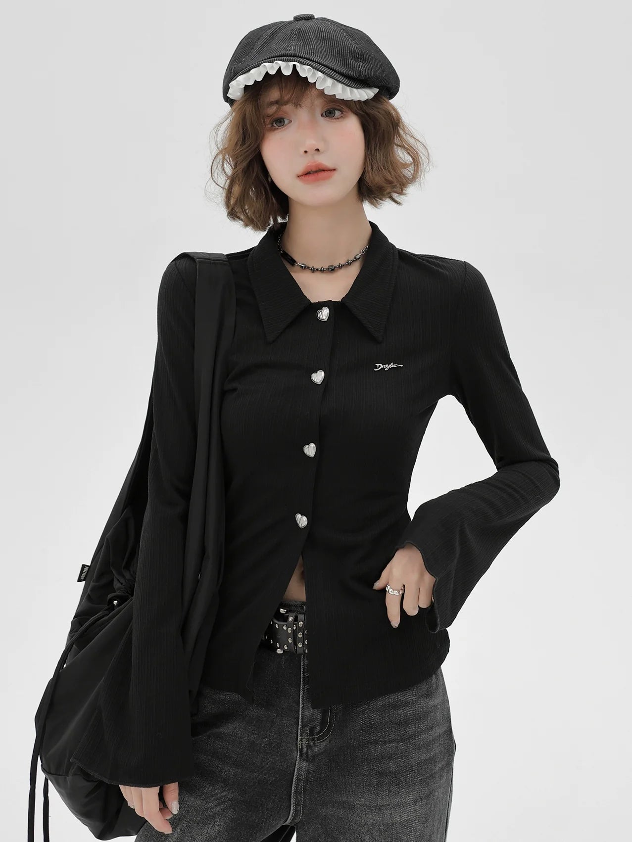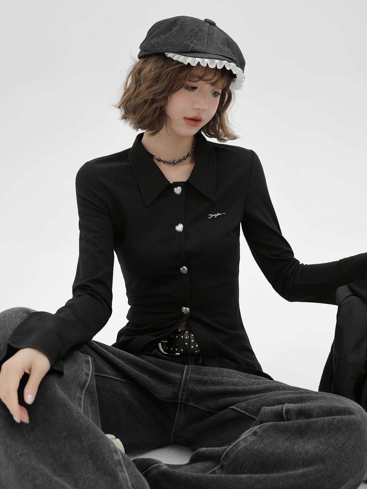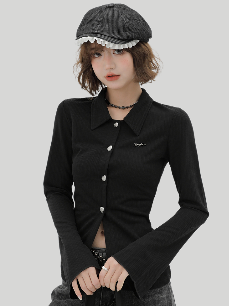 ニットベルブラックスリムポロカラーカーディガンスリーブレトロ