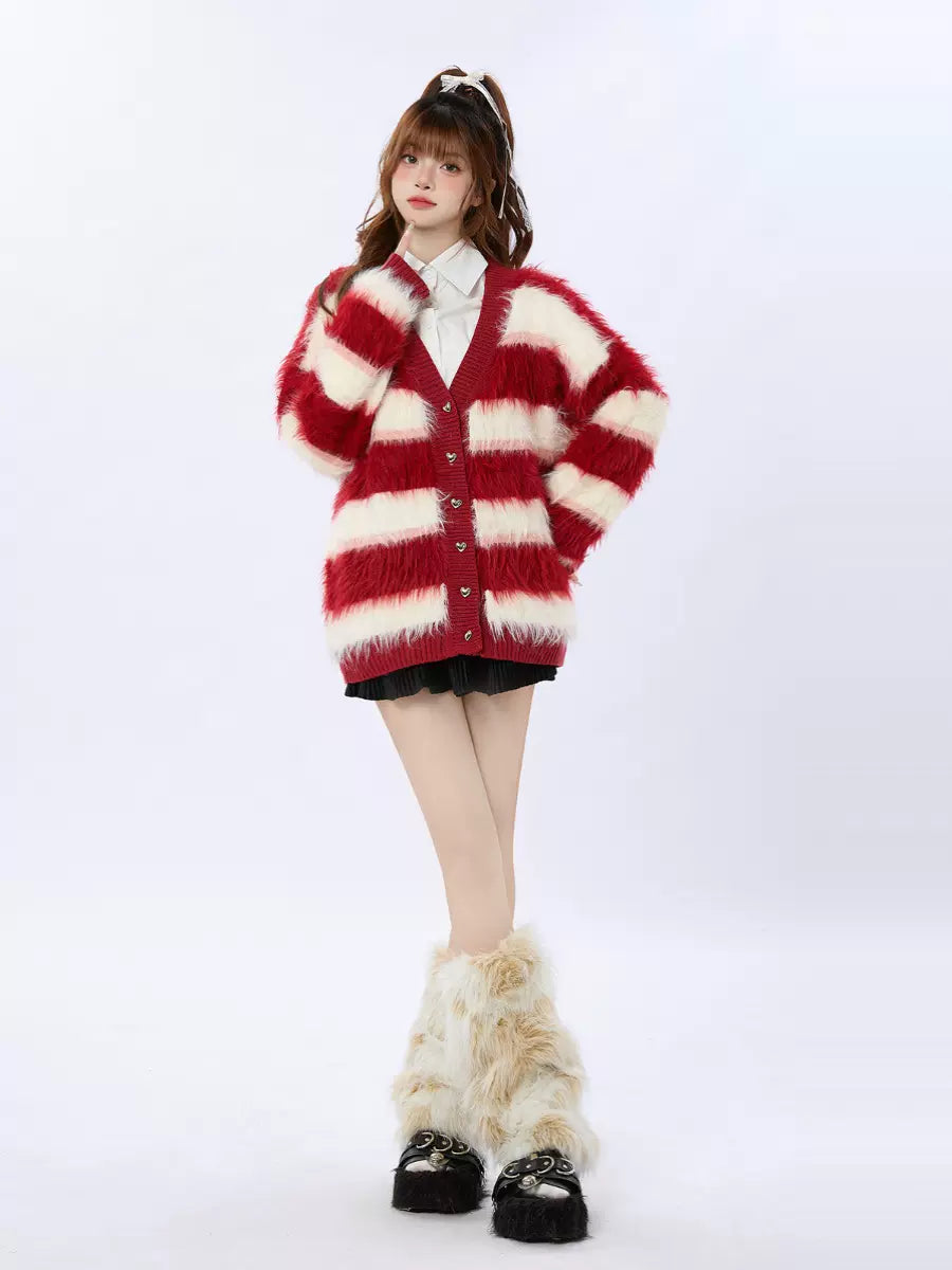 ニットストライプカーディガン レトロレッド