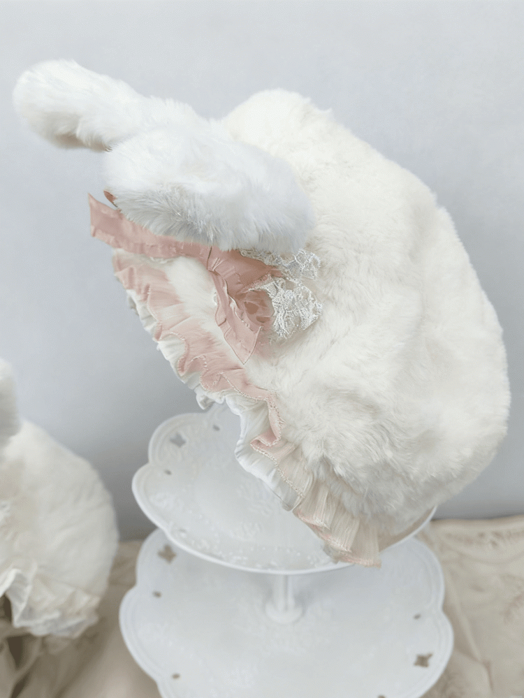 Lace Bunny Beige/Pink Ears Bow Plush Beret Trim