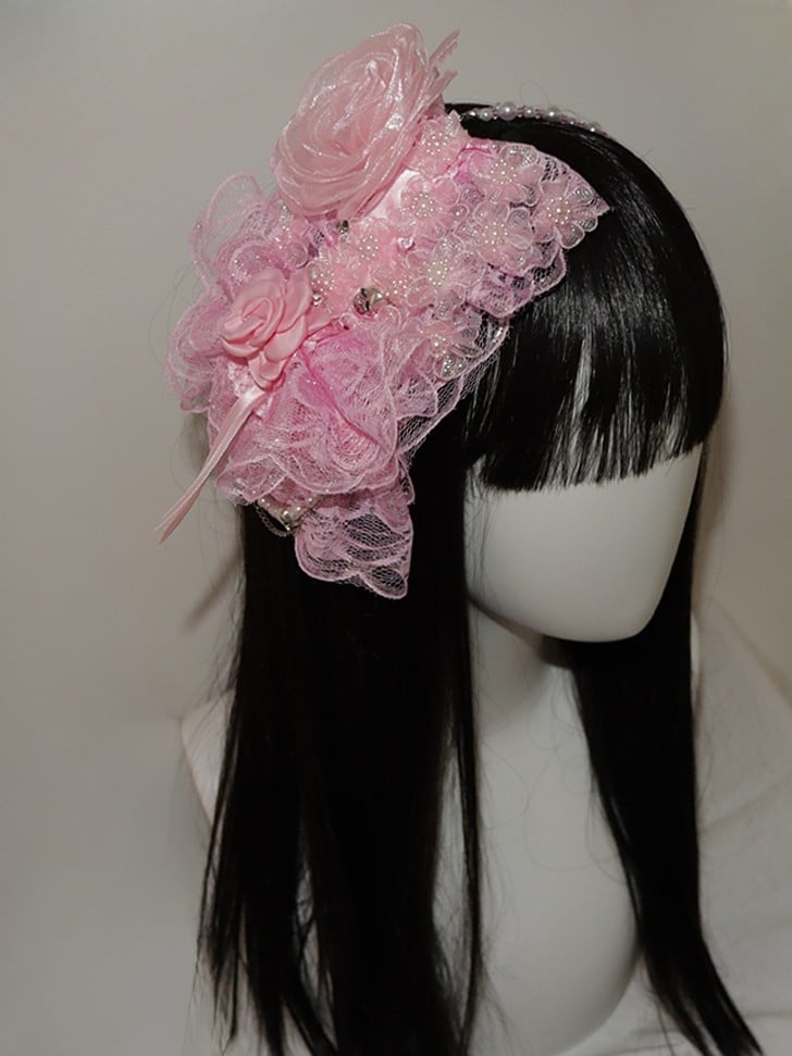 レースの花柄ヘアバンド 装飾トリム ビーズデザイン ピンク