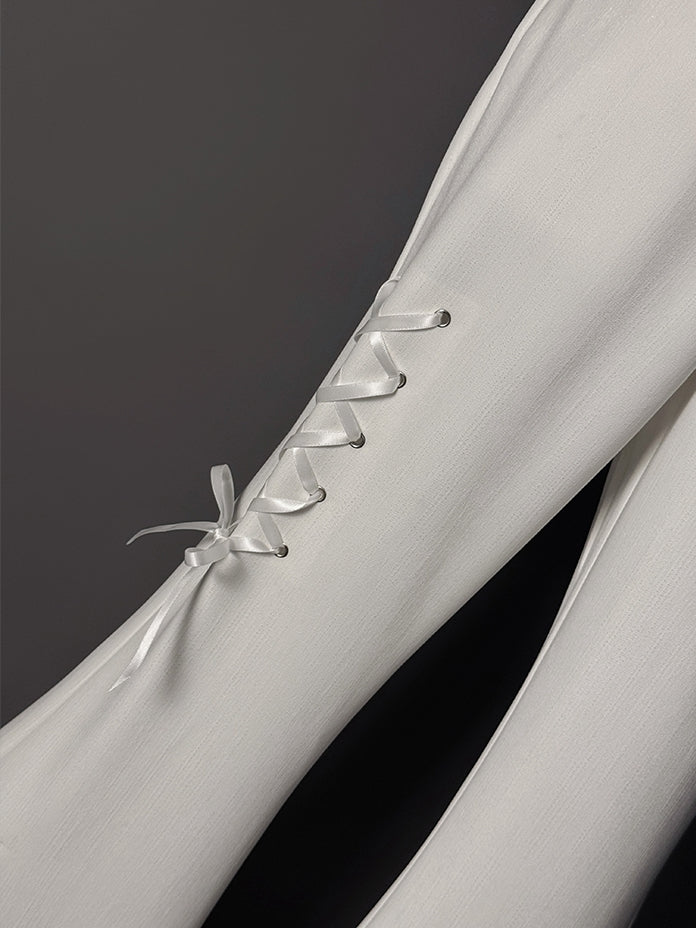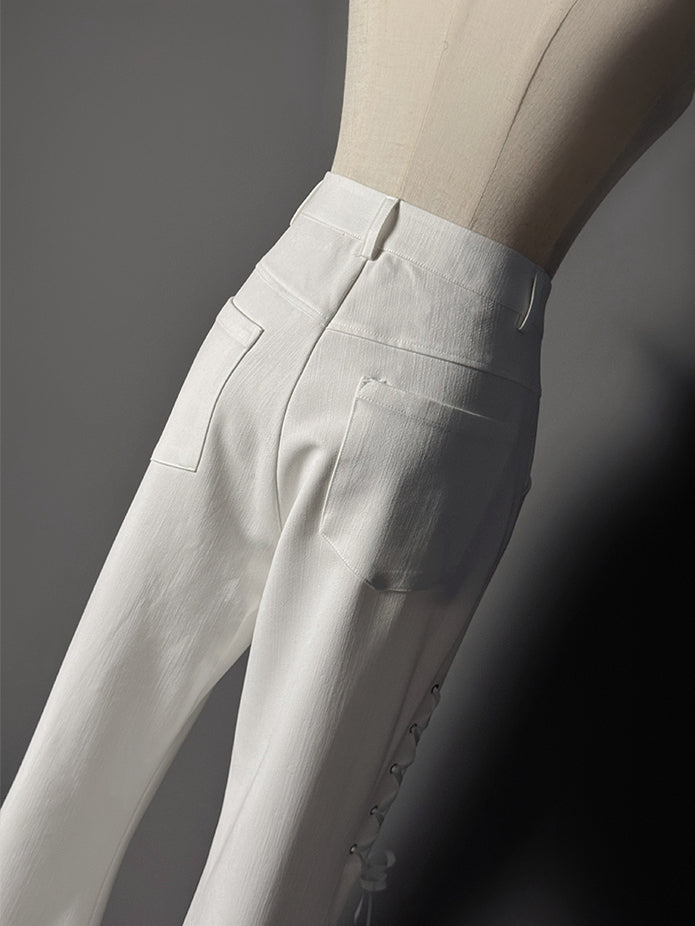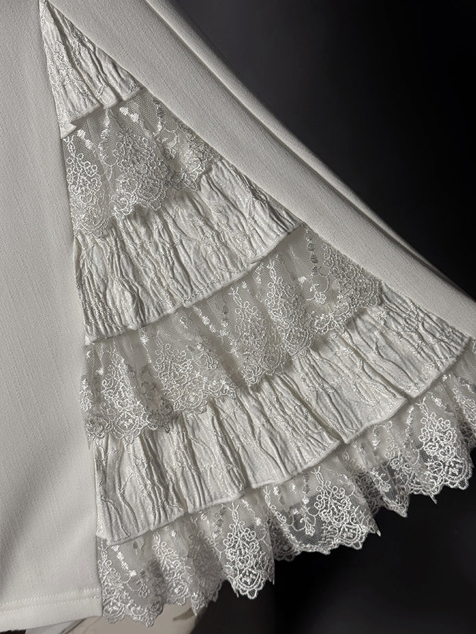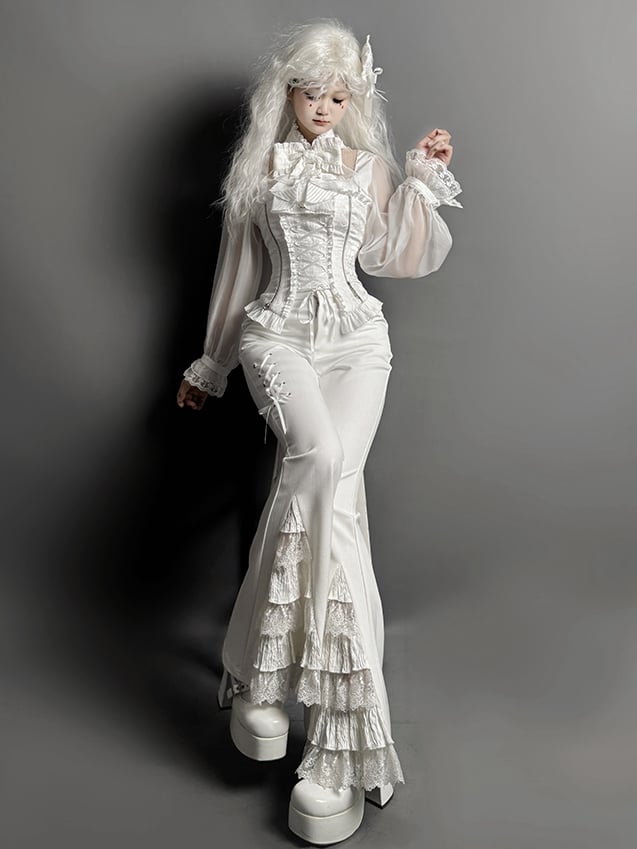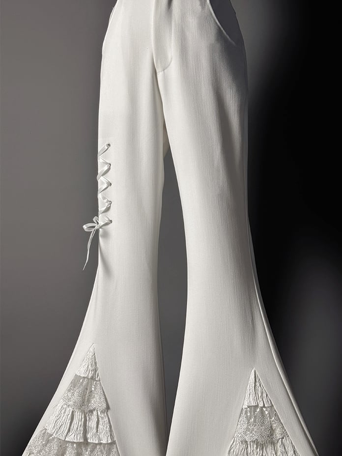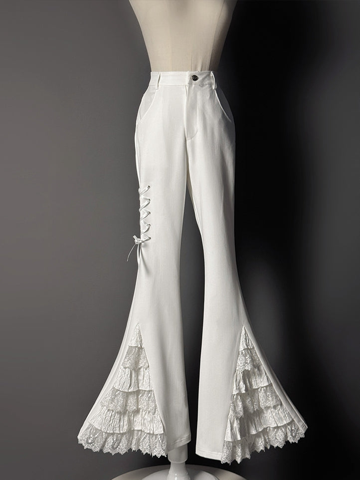 ホワイトのティアードレースパッチカフスフレアパンツ