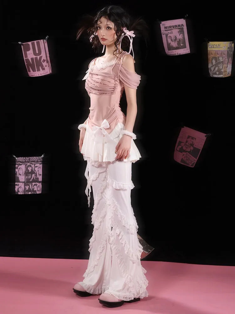 ホワイトバレエコアレースフリルパンツ+セルフタイスカートセット
