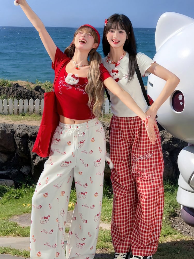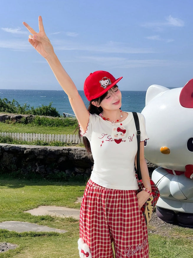 レースアップバック プラッシュキティ レタスヘム ホワイト Tシャツ