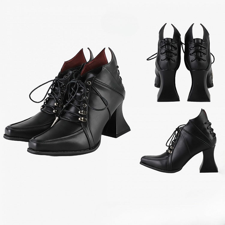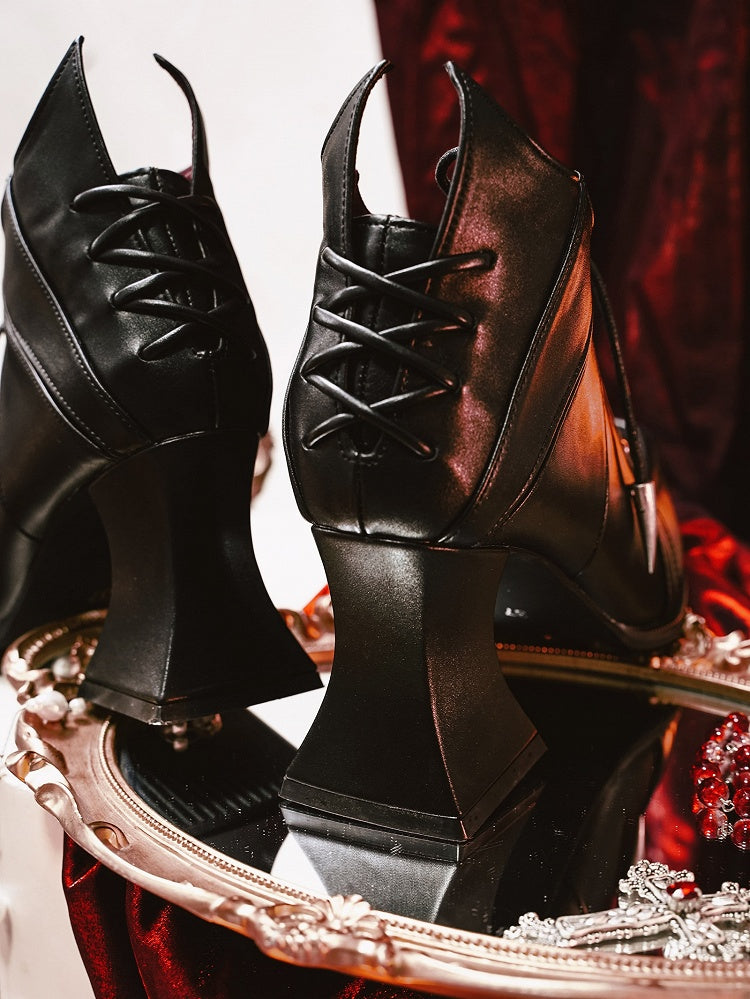 ブラックゴシックフロントレースアップタイワイングラス型ヒールブーツ
