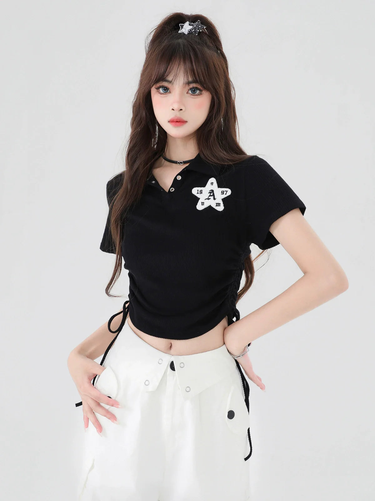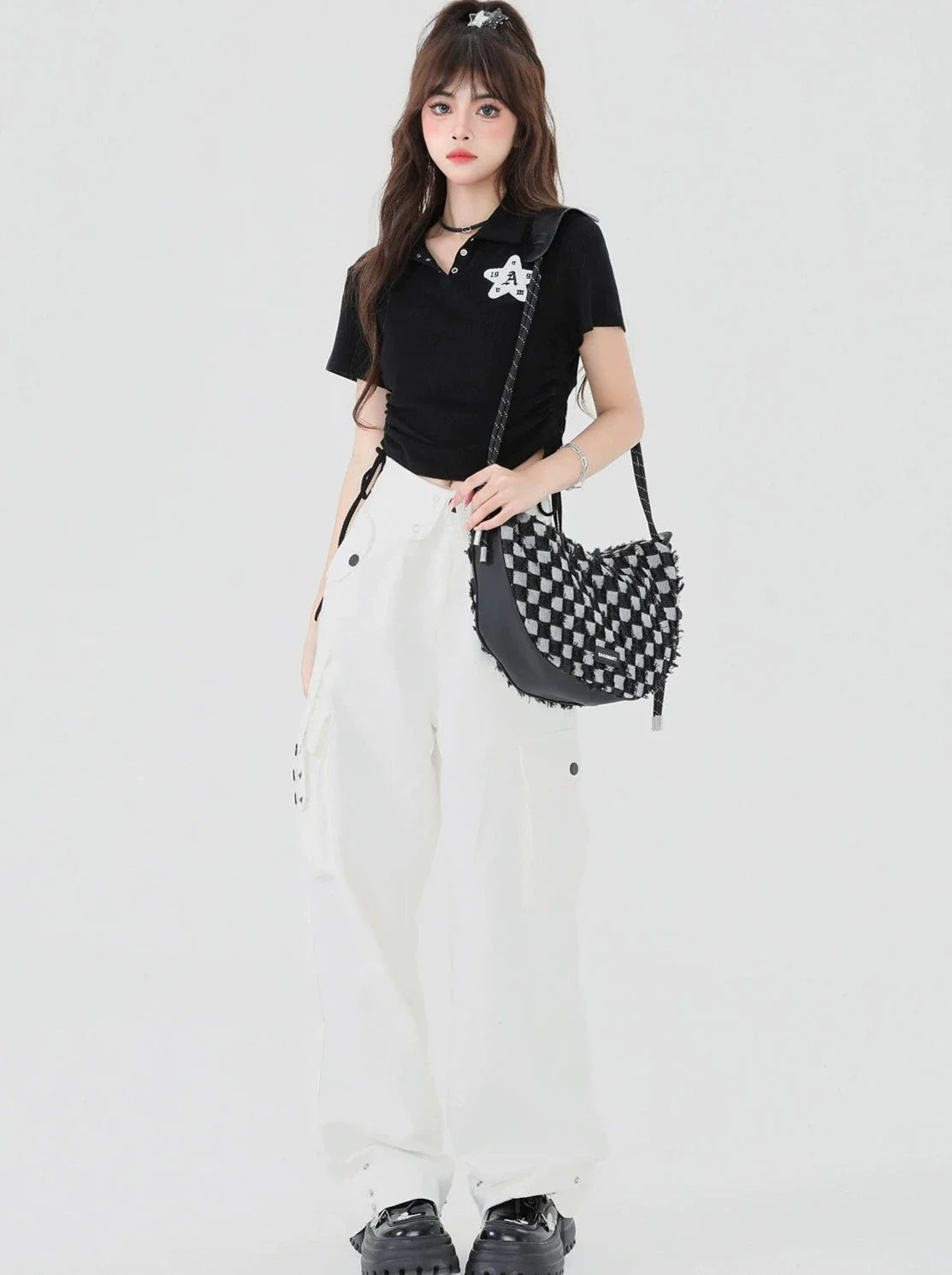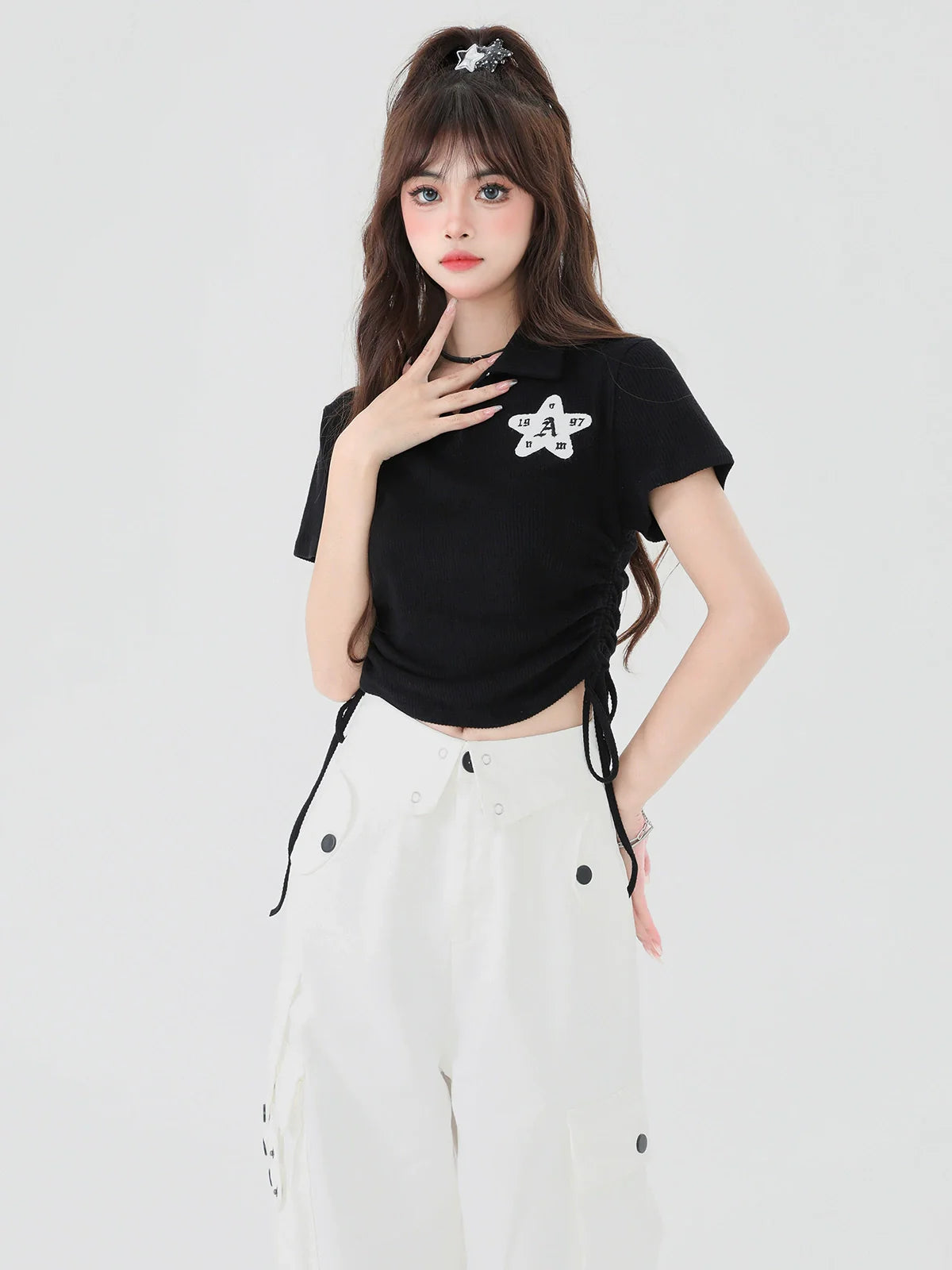 キュートなレースアップボタンウエストトップス。どんなコーディネートにもスタイリッシュなアクセントを添えます。個性的なレースアップデザインとボタンのディテールが特徴で、ウエストを絞って美しいシルエットを演出します。魅力的でファッショナブルなルックに欠かせないアイテムです。