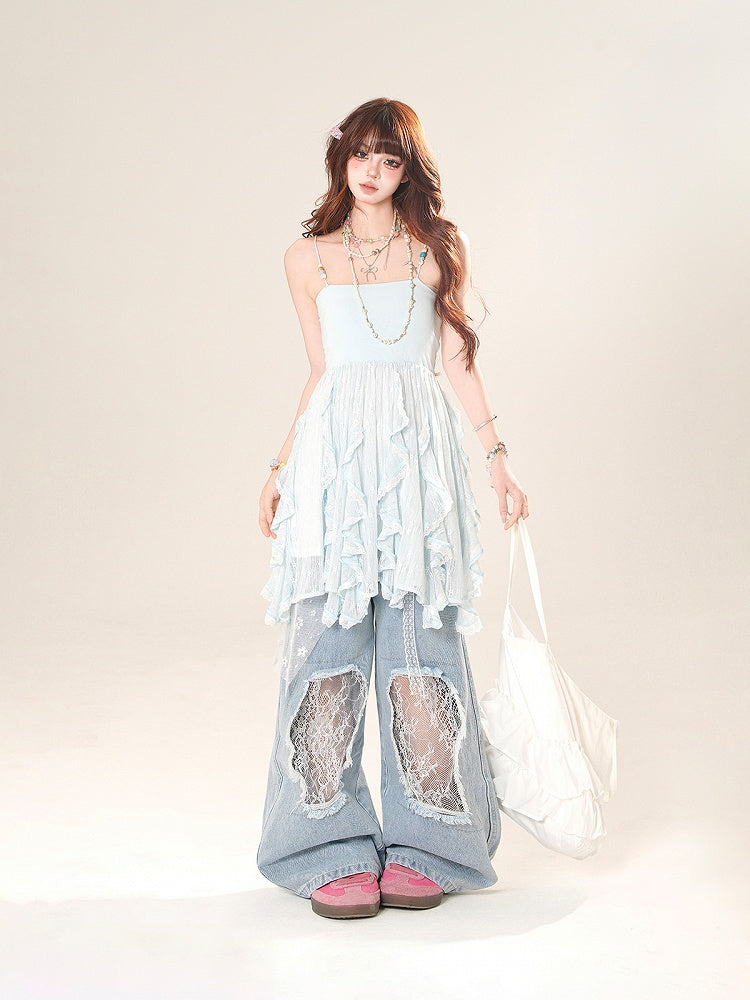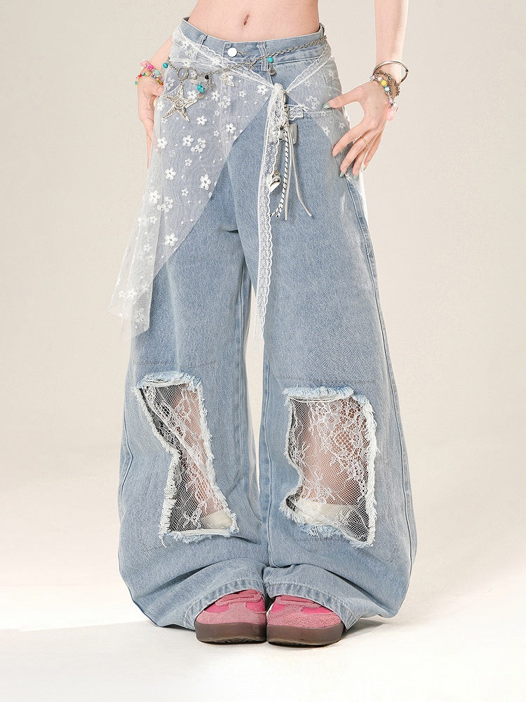 レースウエストアクセサリーパッチ付きブルーローワイドレッグジーンズ(ウエストダメージ加工穴付き)