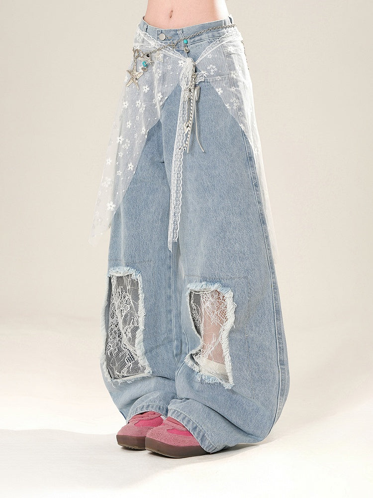 ブルーのローウエスト、ダメージ加工の穴あきレースパッチ、ウエストアクセサリー付きワイドレッグジーンズ