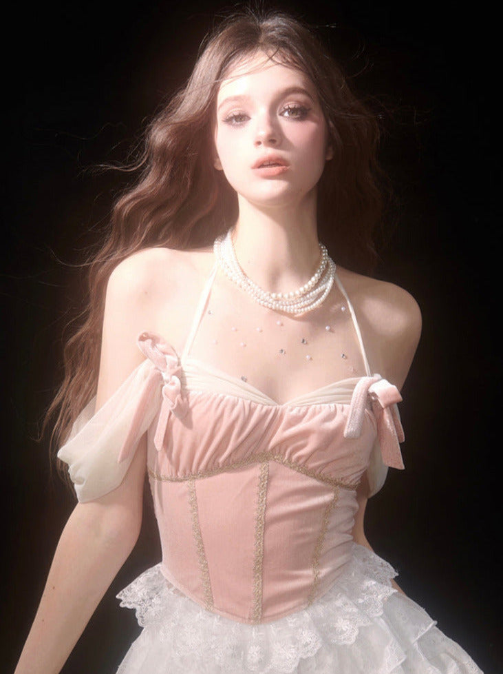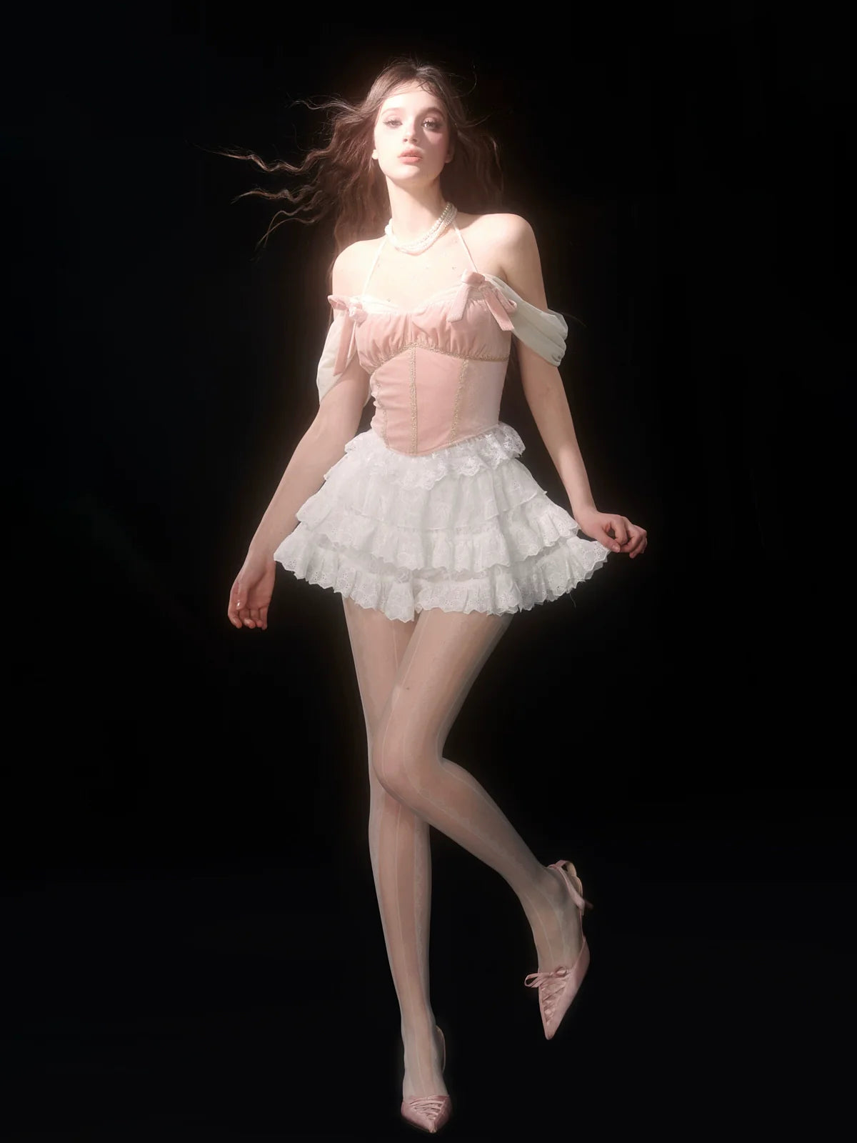 レースホワイトオフショルダーケーキスタイル+バレエスカートトップピンクベルベットストラップ