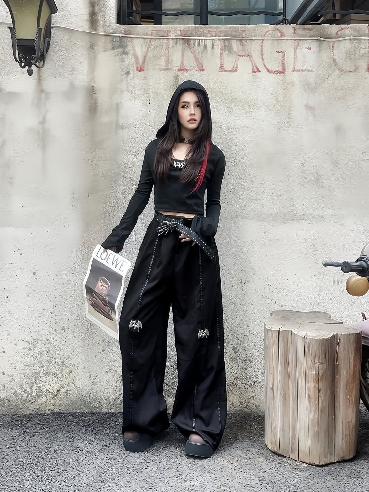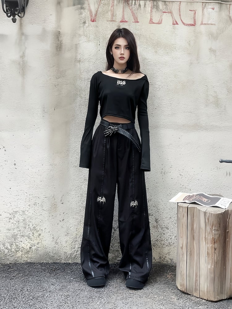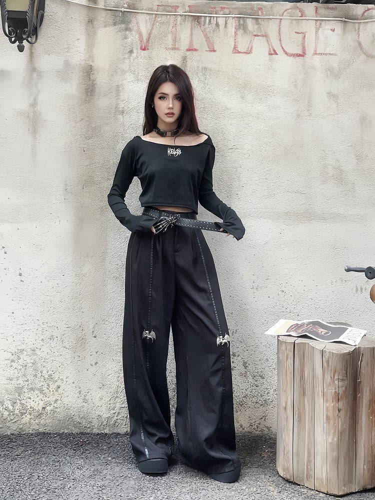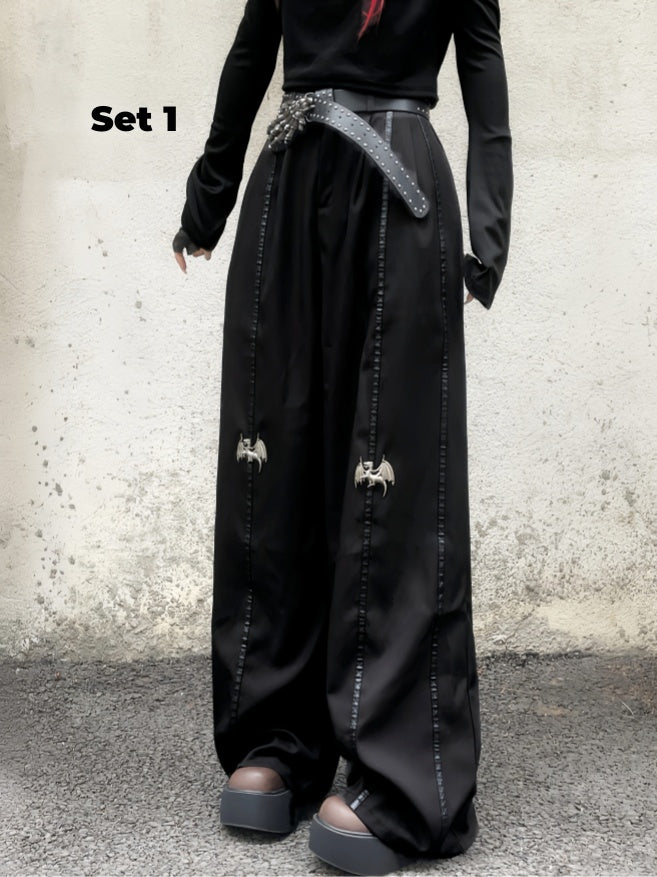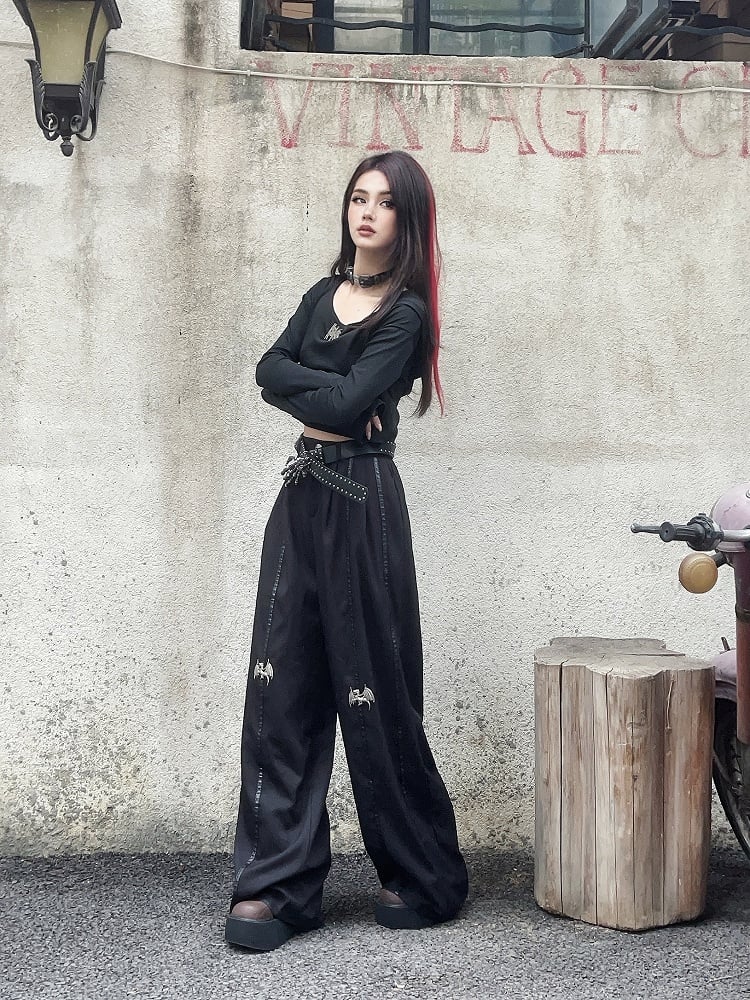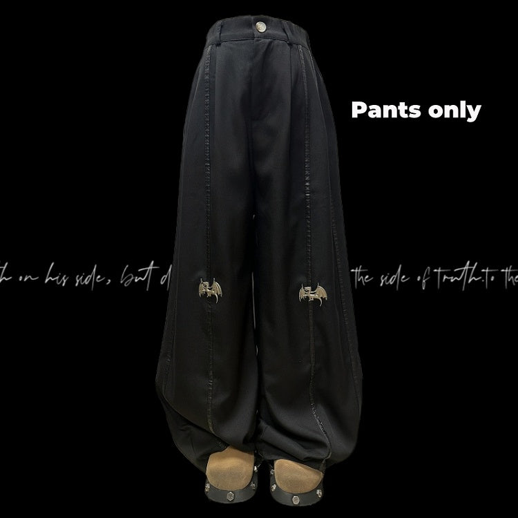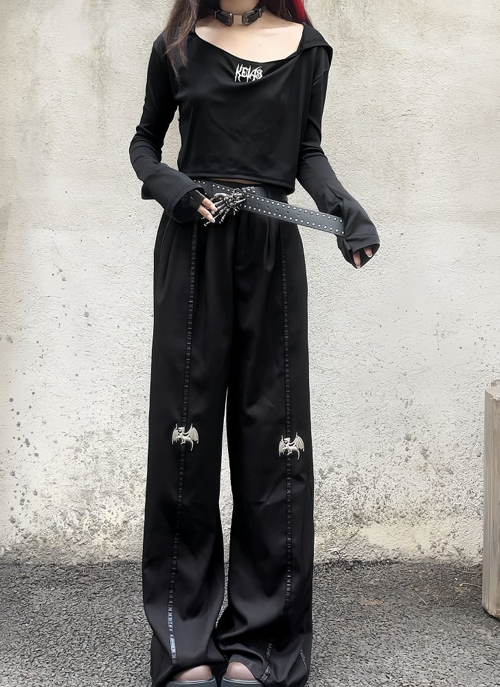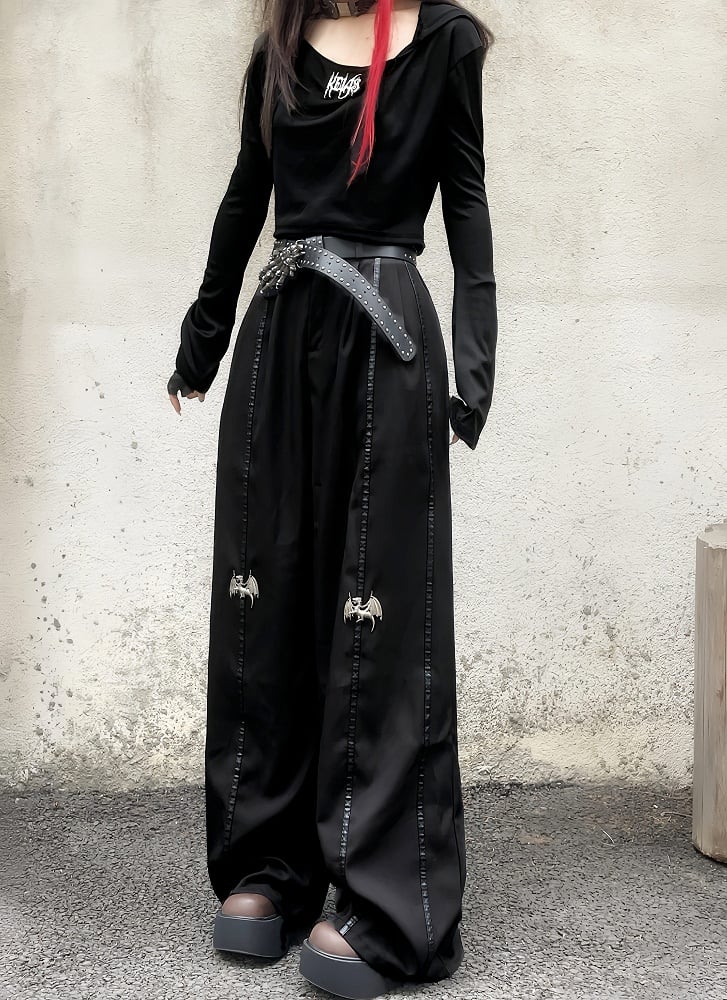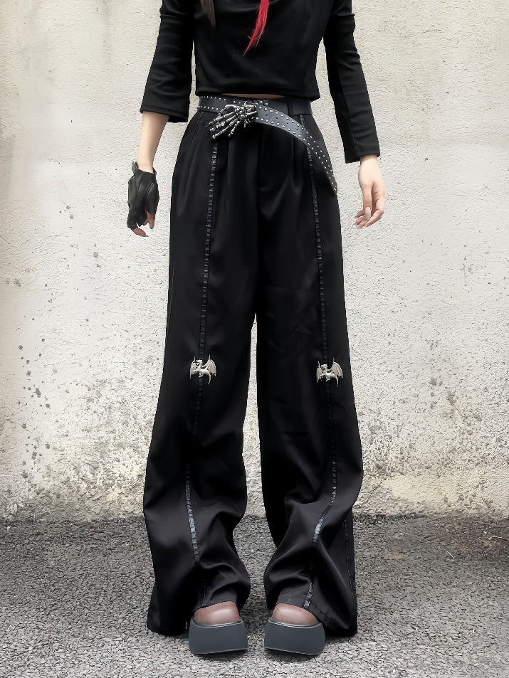 丈長めのフロア ブラック メタル ドラゴン ニー ワイドレッグ パンツ