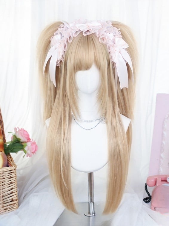 ブロンド 65-70cm 長さストレートウィッグ(フルバング付き)+ 35cm ダブルストレートポニーテール クロークリップ