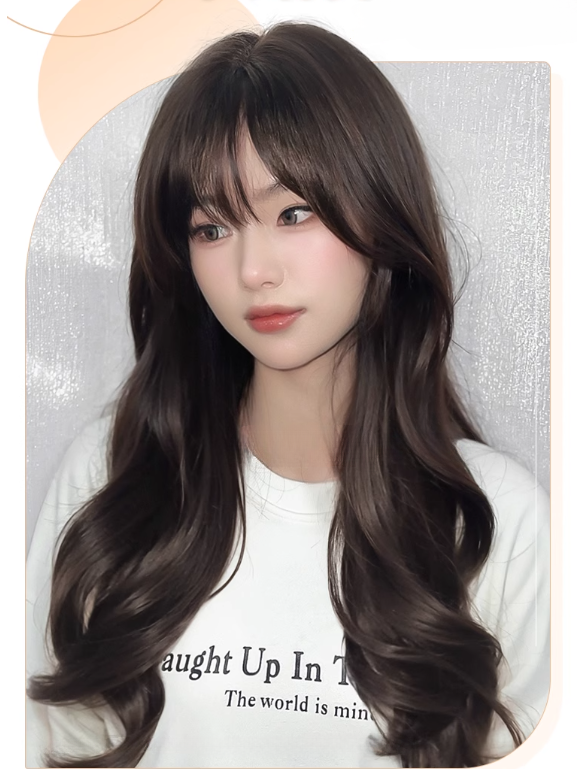 長さ65cmのウィッグ付き、ブラウンのウェーブ前髪