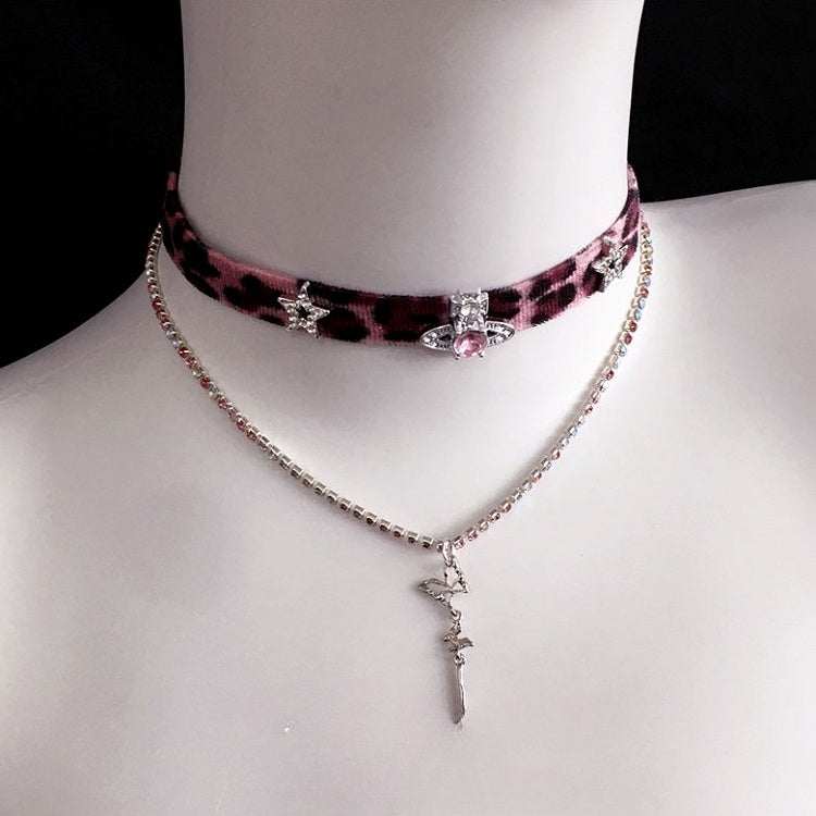 Pink Leopard Print Choker with Star and Rhinestone Decorations