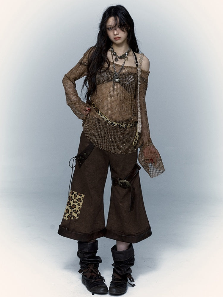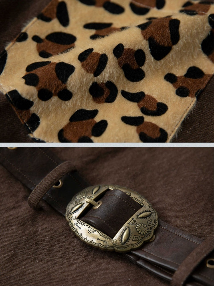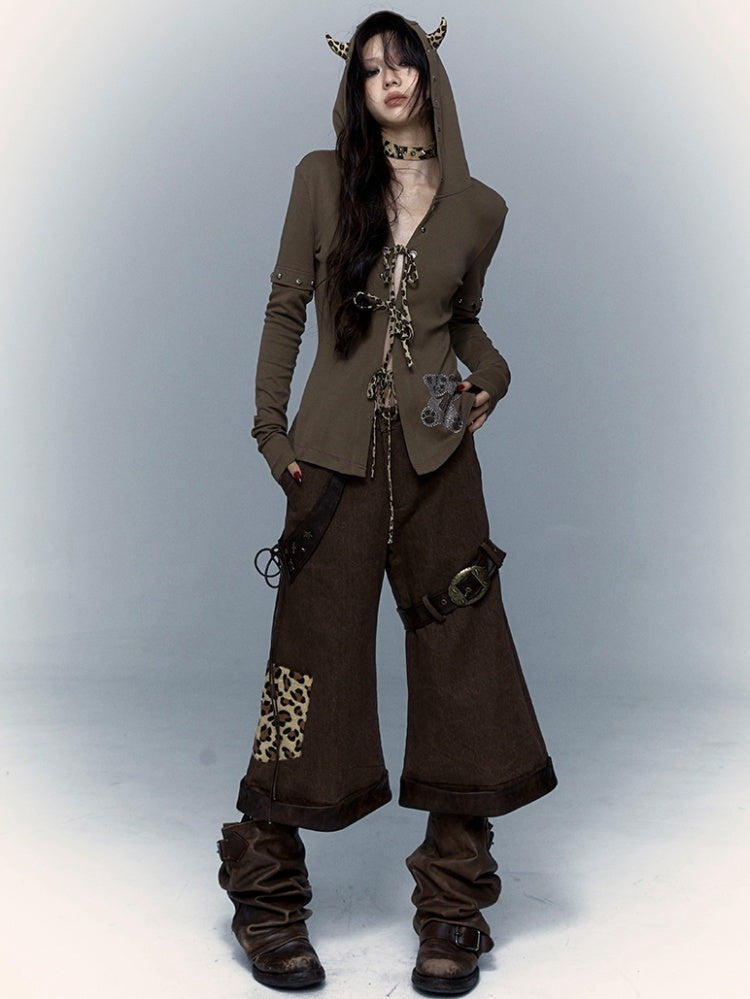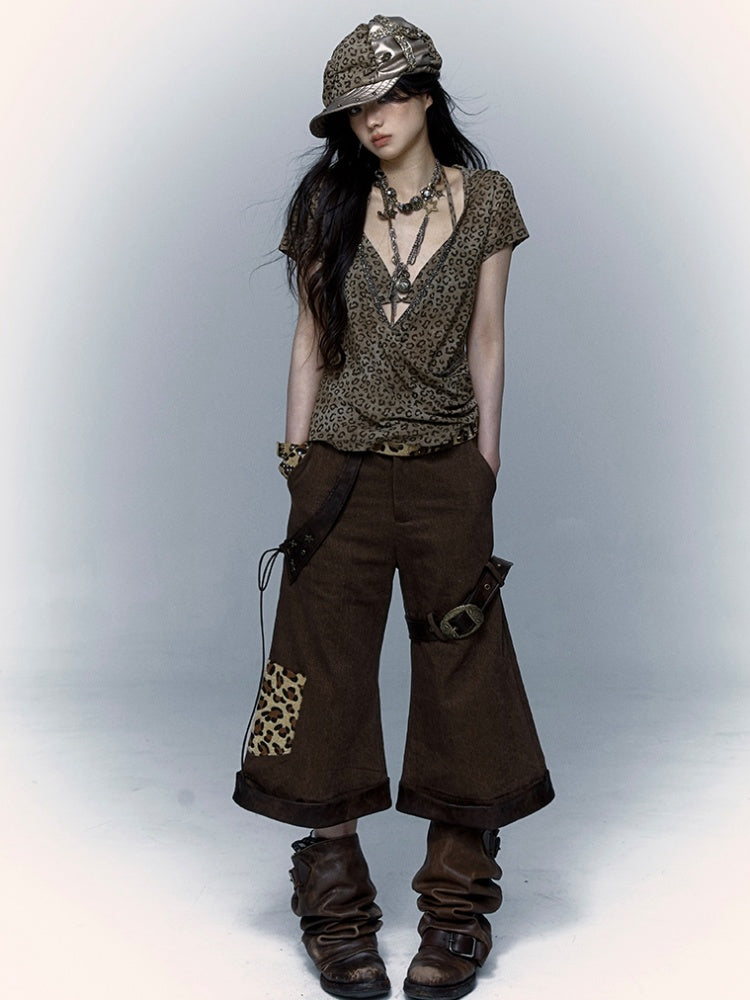 ヒョウ柄ポケット付きブラウンパンクローウエストパンツ