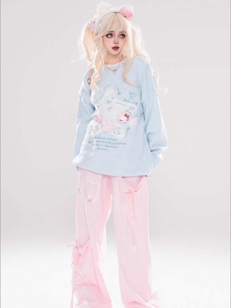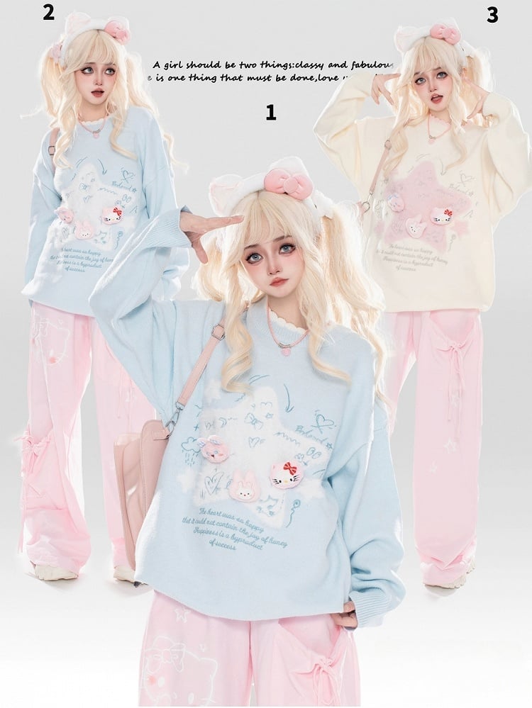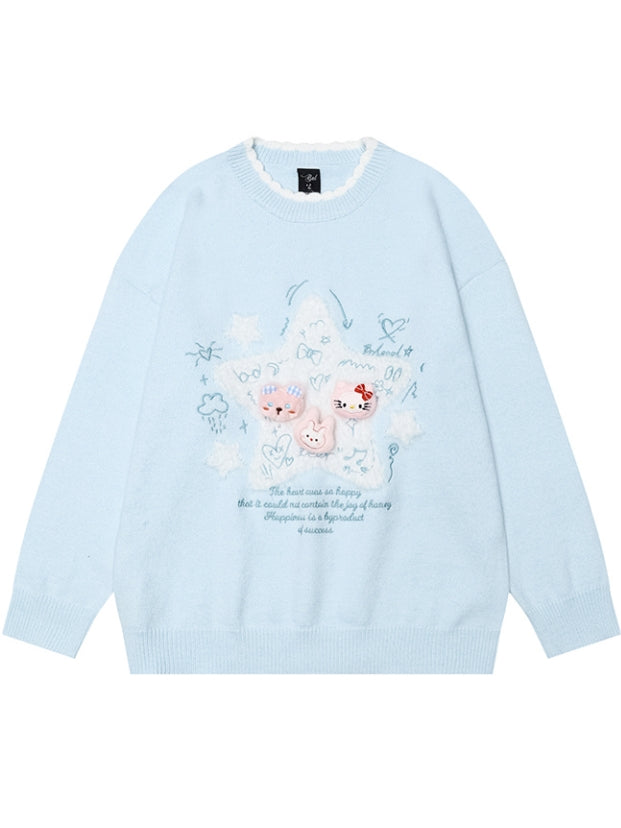 ライトブルー/ライトイエローの星のアップリケがキュートな猫ちゃんをあしらったゆったりセーター