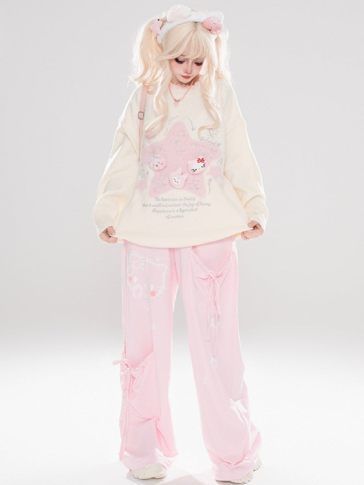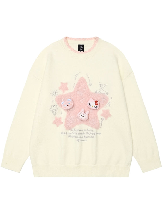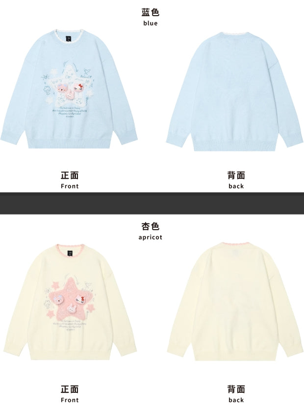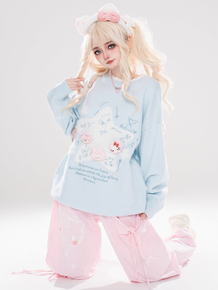 キュートで愛らしいこのセーターは、ライトブルーとライトイエローの星のアップリケと、キュートな猫ちゃんたちがあしらわれています。ゆったりとしたフィット感で、快適さとスタイリッシュさを両立。このユニークなセーターで、心地よくスタイリッシュに過ごしましょう。