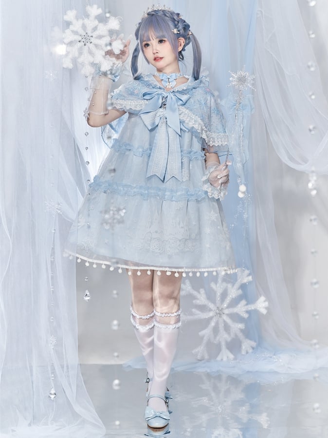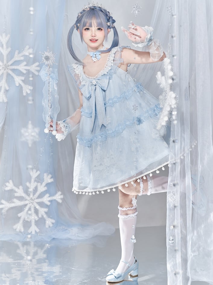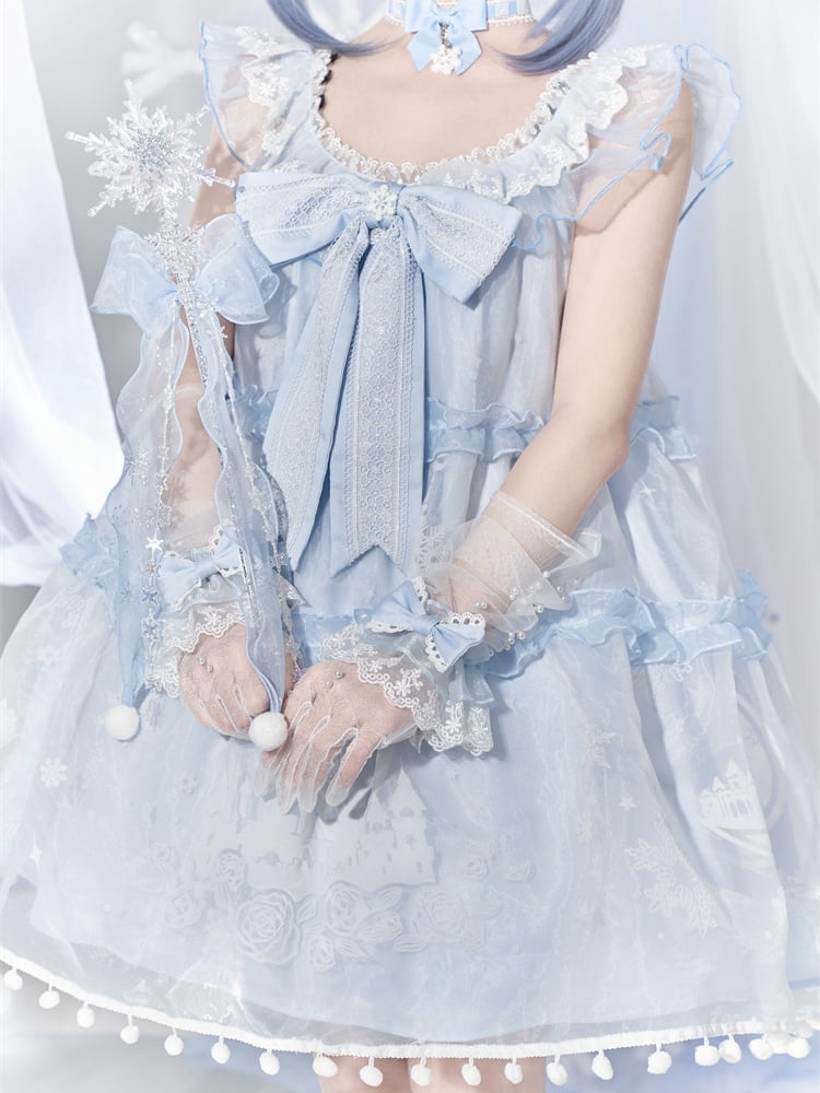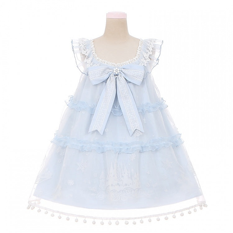 ライトブルーのスノームーンキャッスルオーバーレイポンポントリムドレススイートロリータジャンパースカート