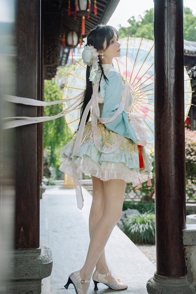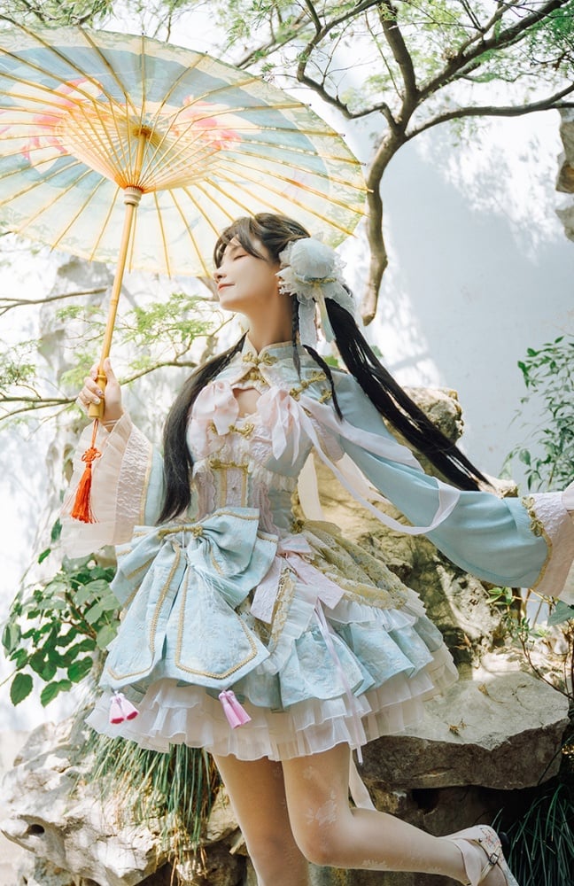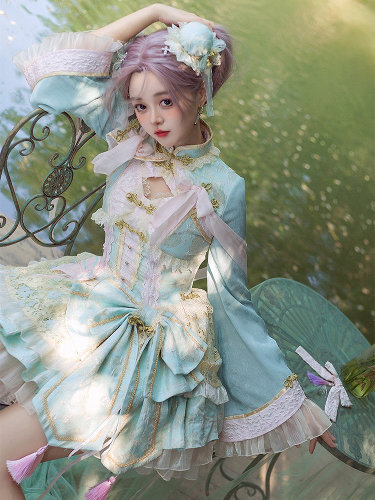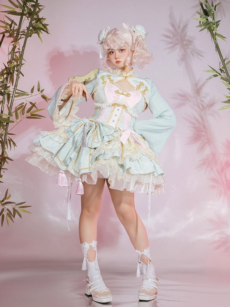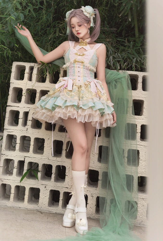 ライトグリーンとピンクの配色が甘くフェミニンな雰囲気を醸し出し、コルセットウエストのディテールがスタイルアップ効果を演出します。取り外し可能なチャイナカラーがエレガントな雰囲気を添え、様々なシーンで活躍する万能アイテムです。ウエストには大きなリボンをあしらったこのジャンパースカートは、ロリータファッション好きの方にもきっと気に入っていただけるはずです。