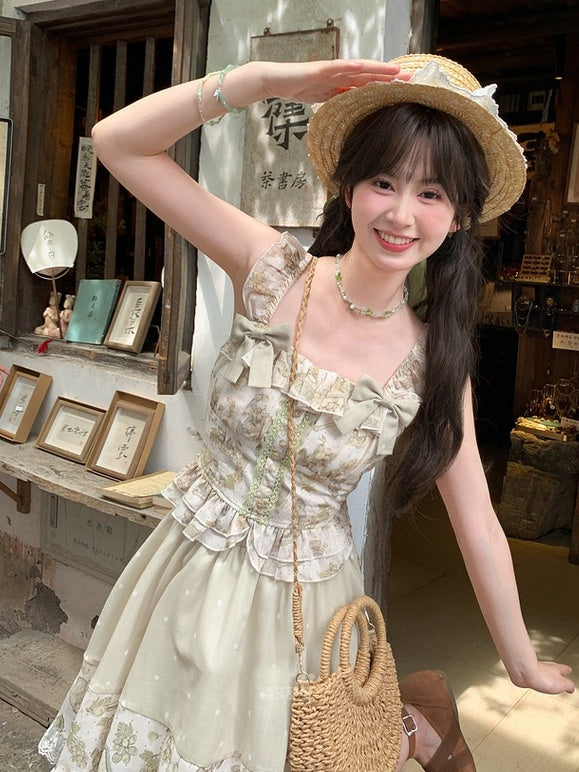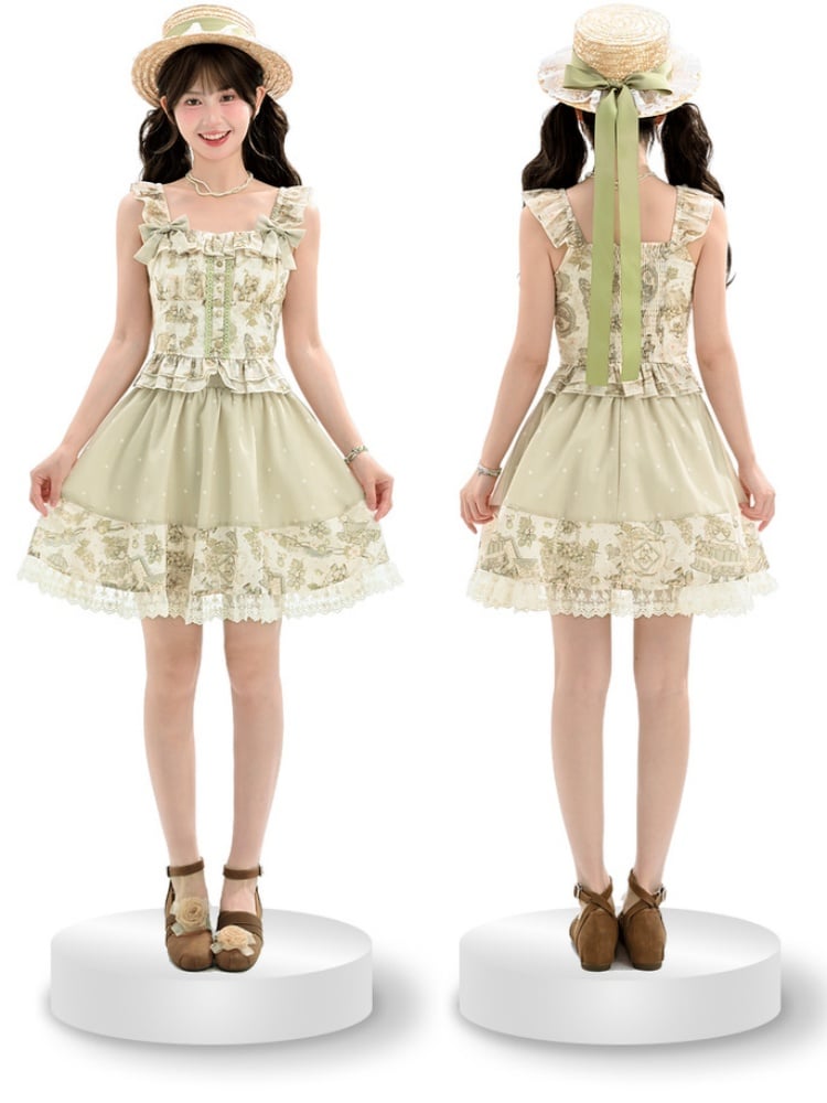 取り外し可能な蝶結び付きライトグリーンのヴィンテージグレーププリントノースリーブトップス