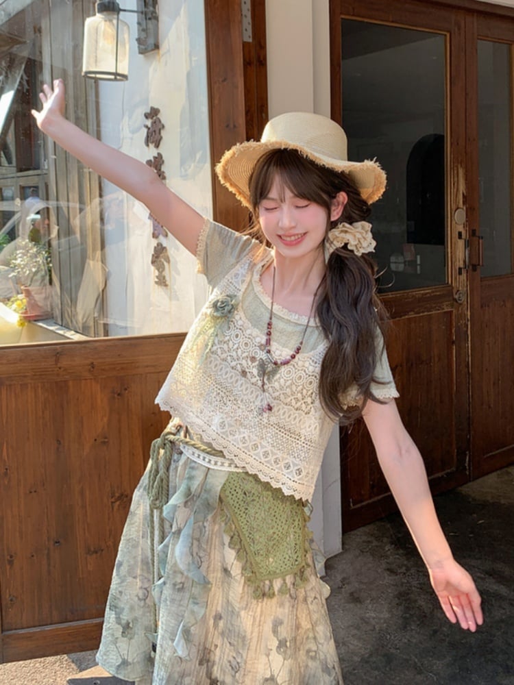ライトネック レース ホルターネック 森系 グリーントリム Tシャツ ラウンドネック