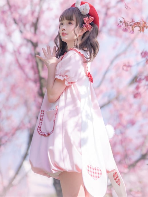 淡いピンクのうさぎ耳、ピーターパンカラー、そしてバブルスカートが特徴の、愛らしいドレスです。どんなお洋服にもキュートなアクセントを添えてくれます!