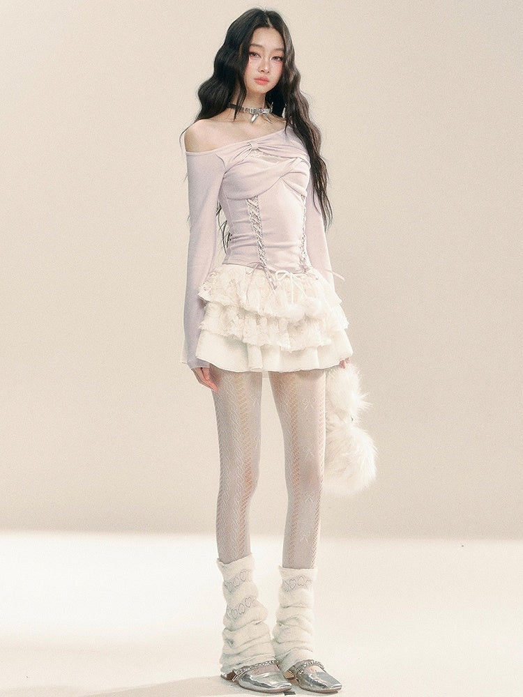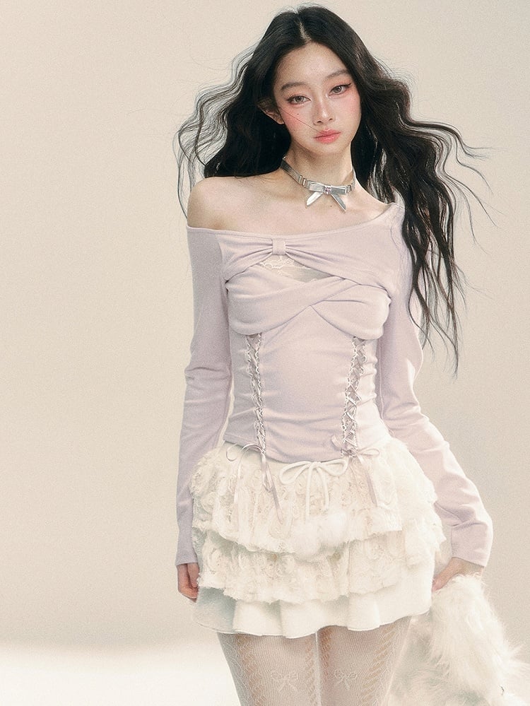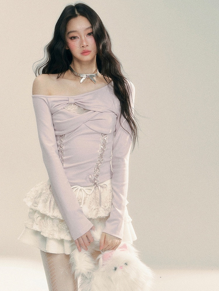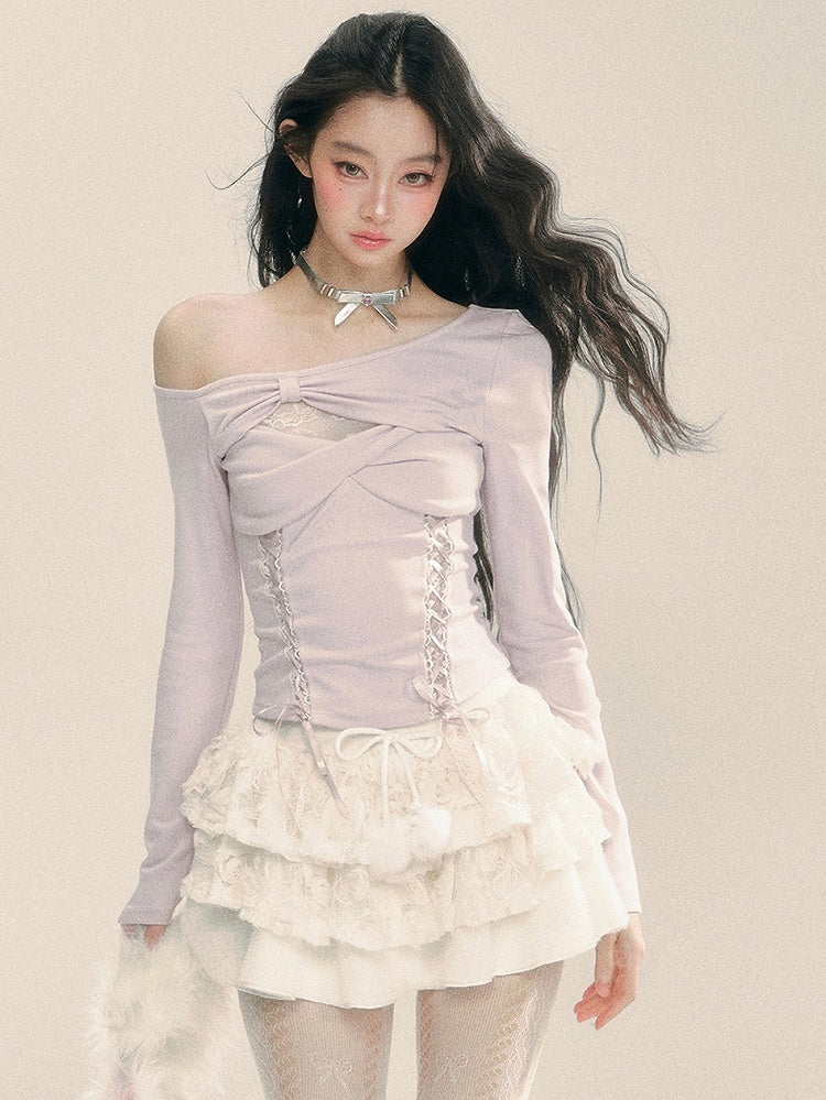 ライトパープルのカットアウトデザイン レースアップ ニットトップス