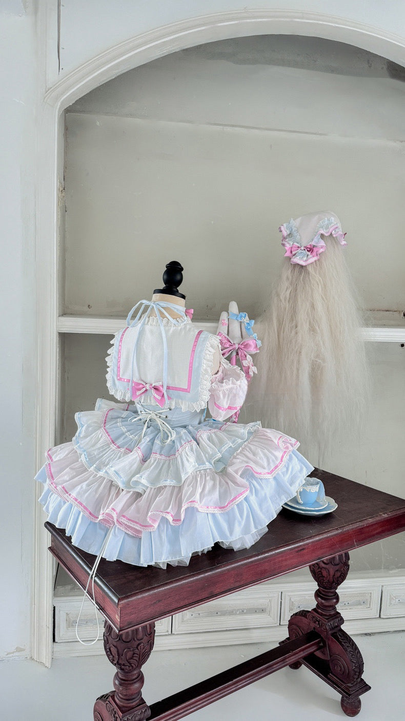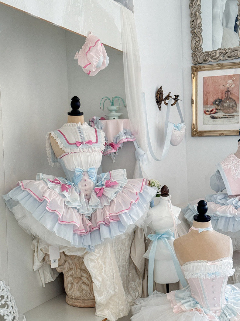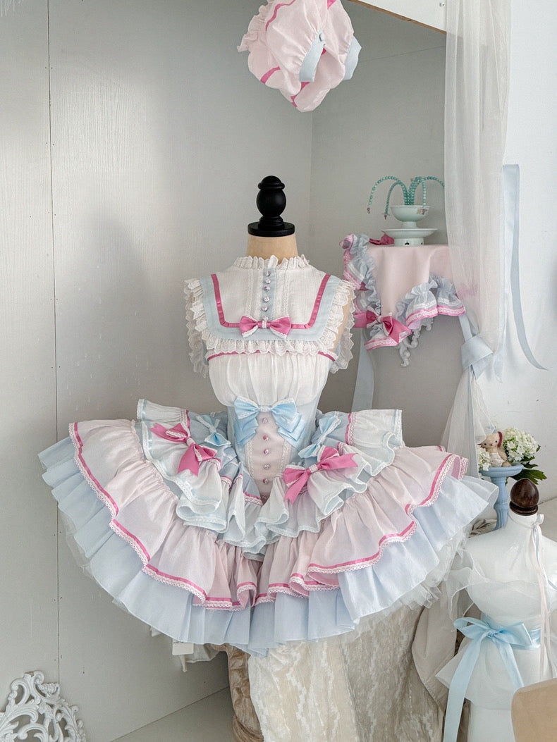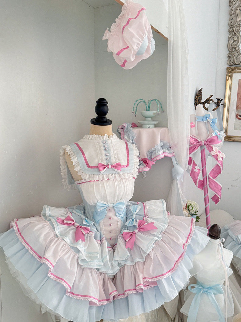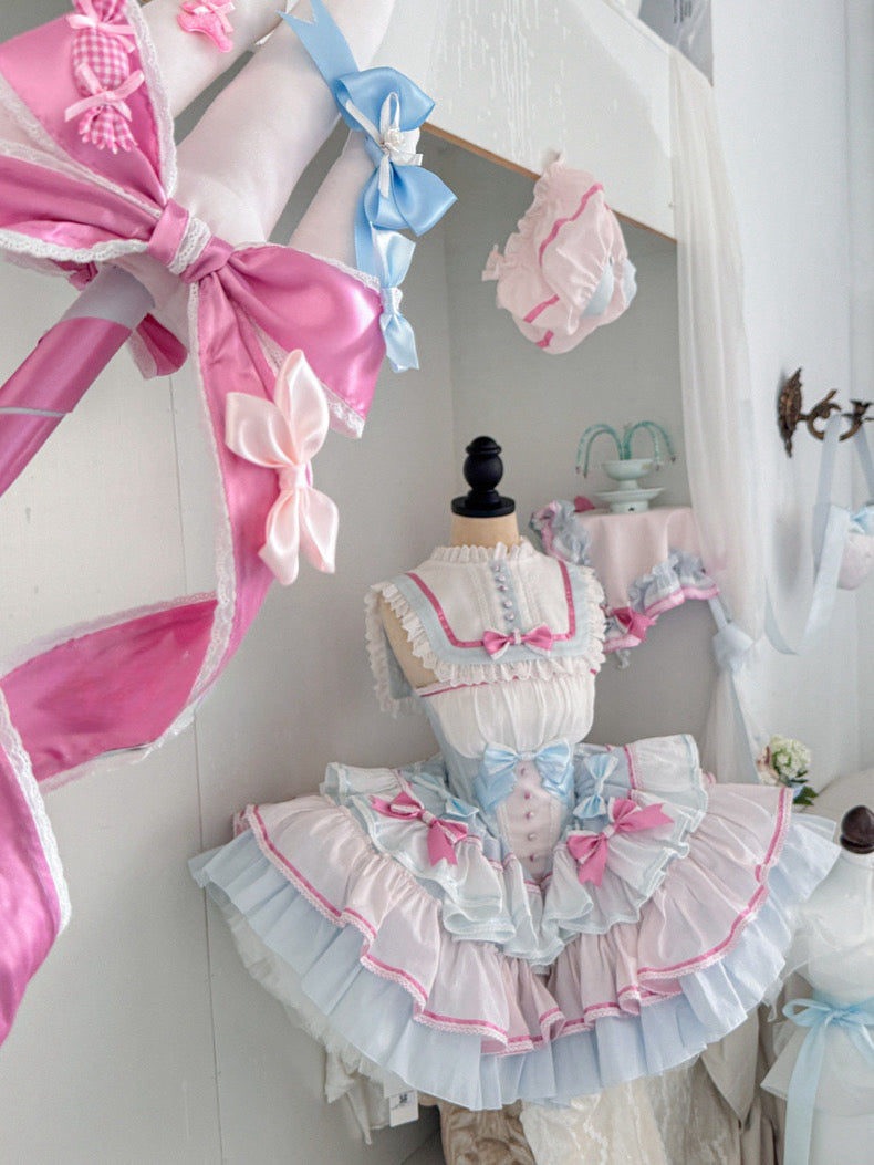 青と白のオールドスクールロリータファッションドレス 蝶結びディテール JSK セット