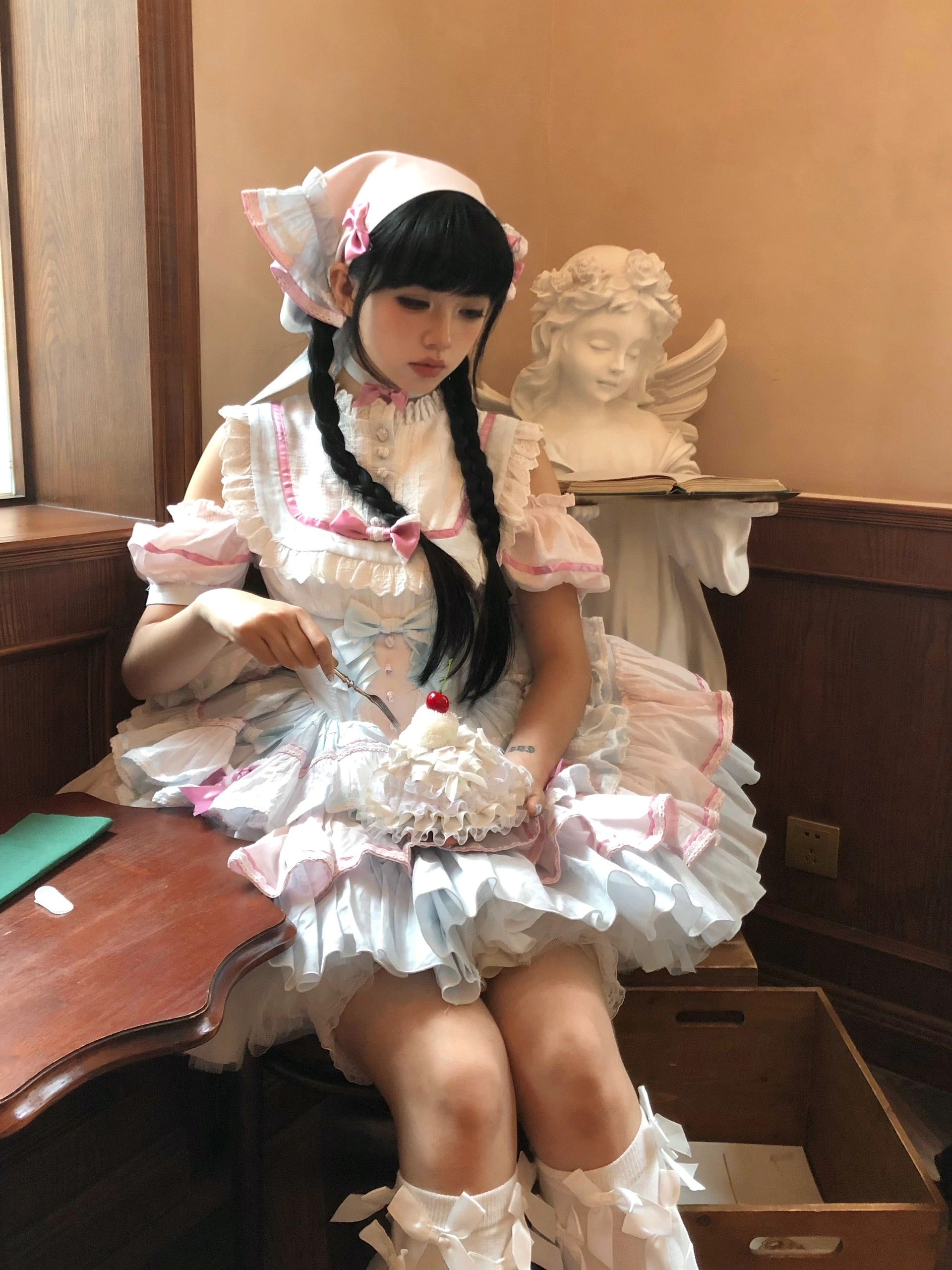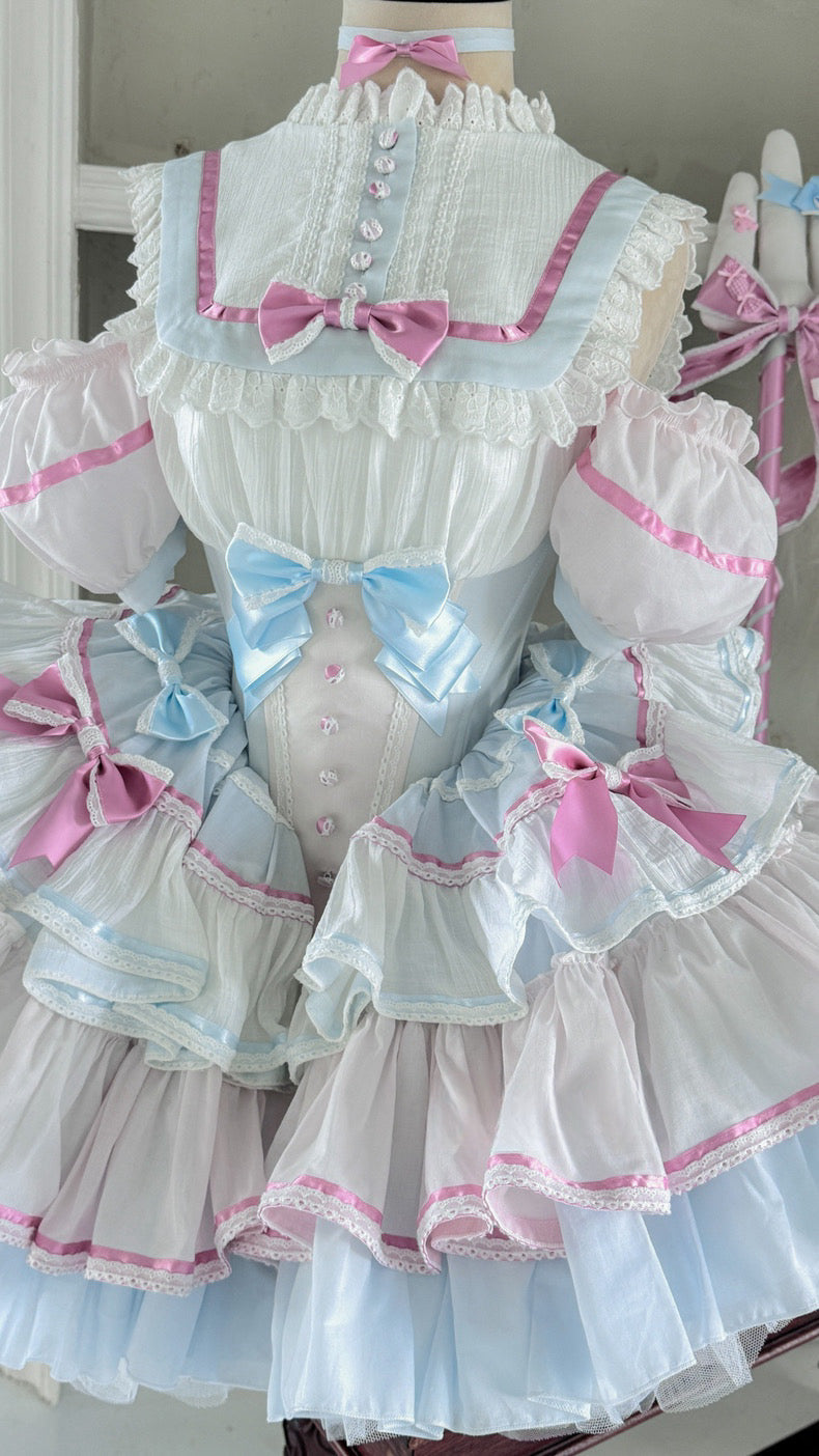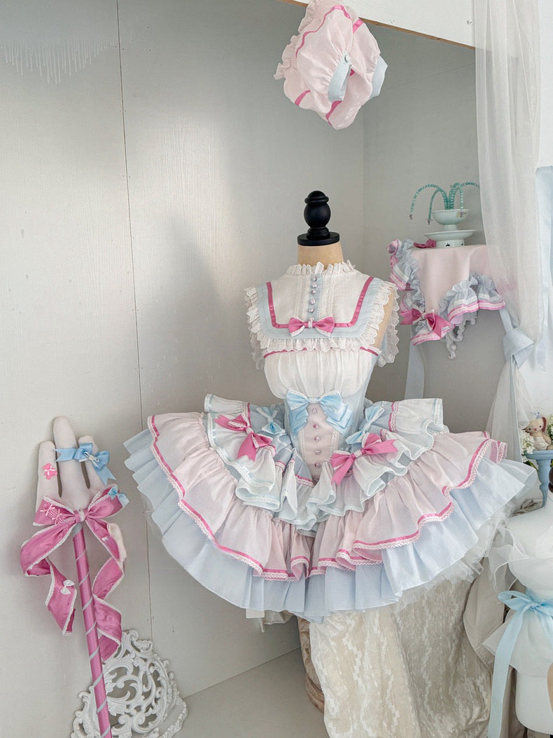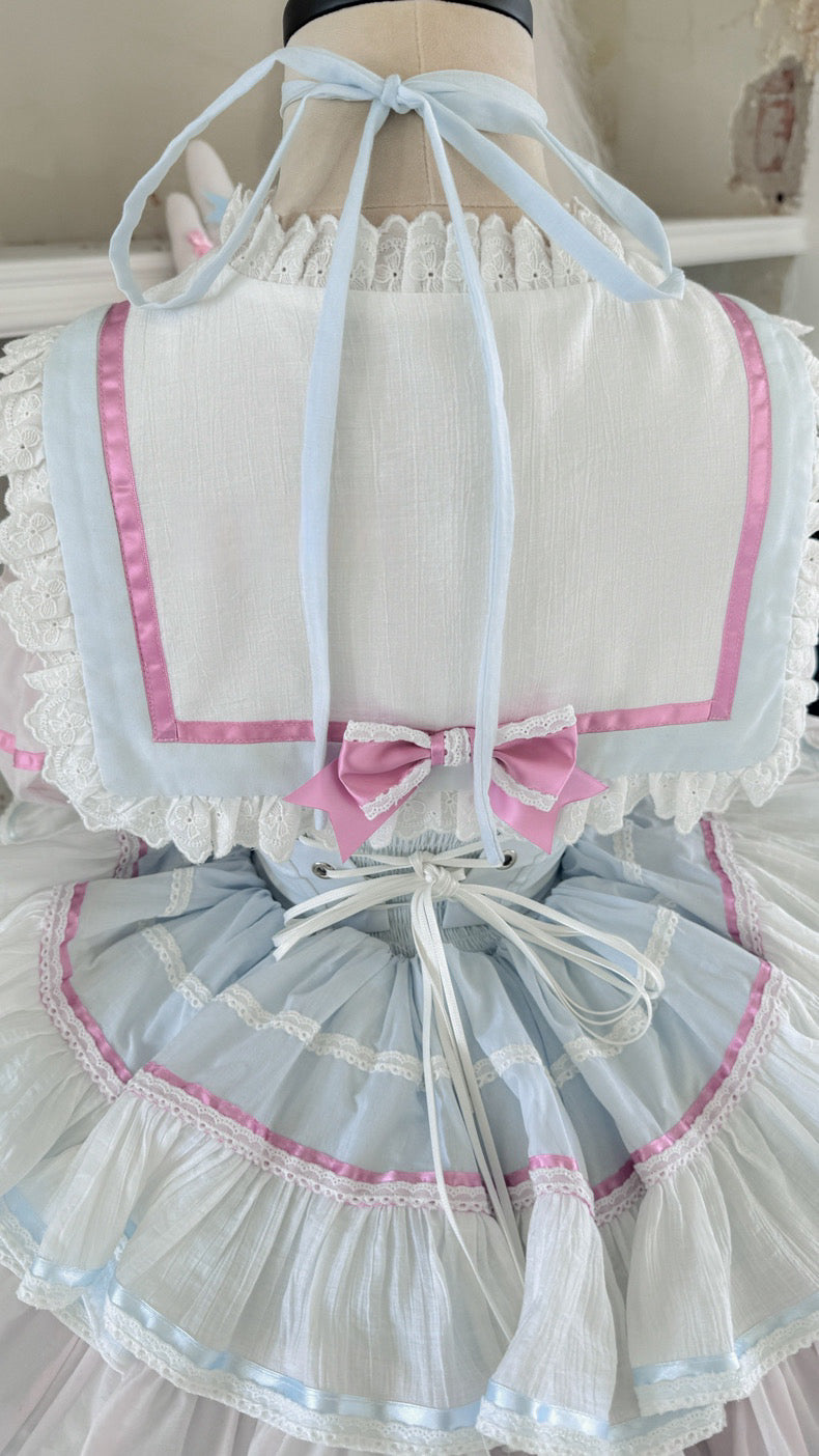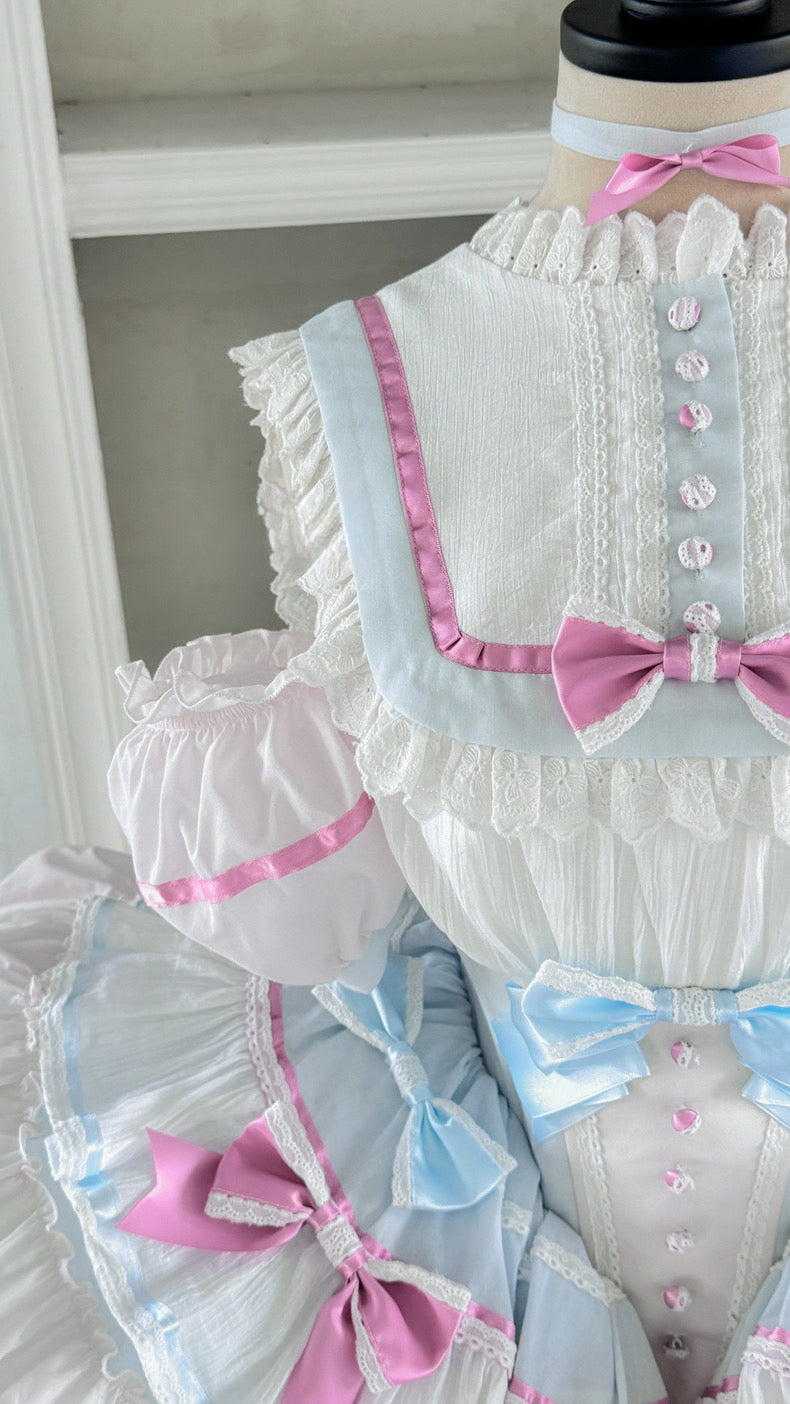 青と白のオールドスクールロリータファッションドレス 蝶結びディテール JSK セット