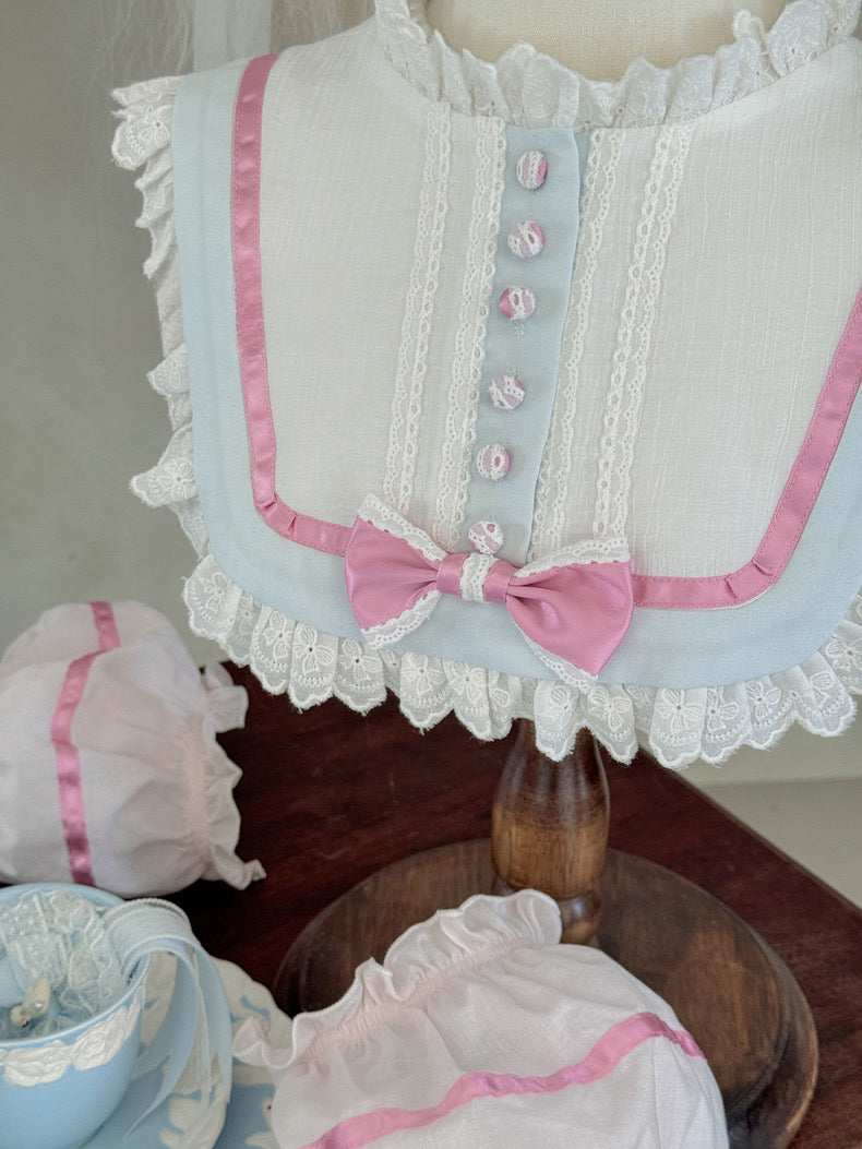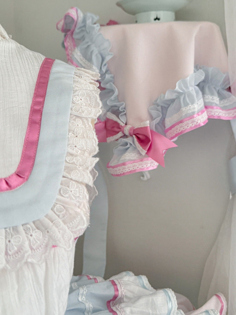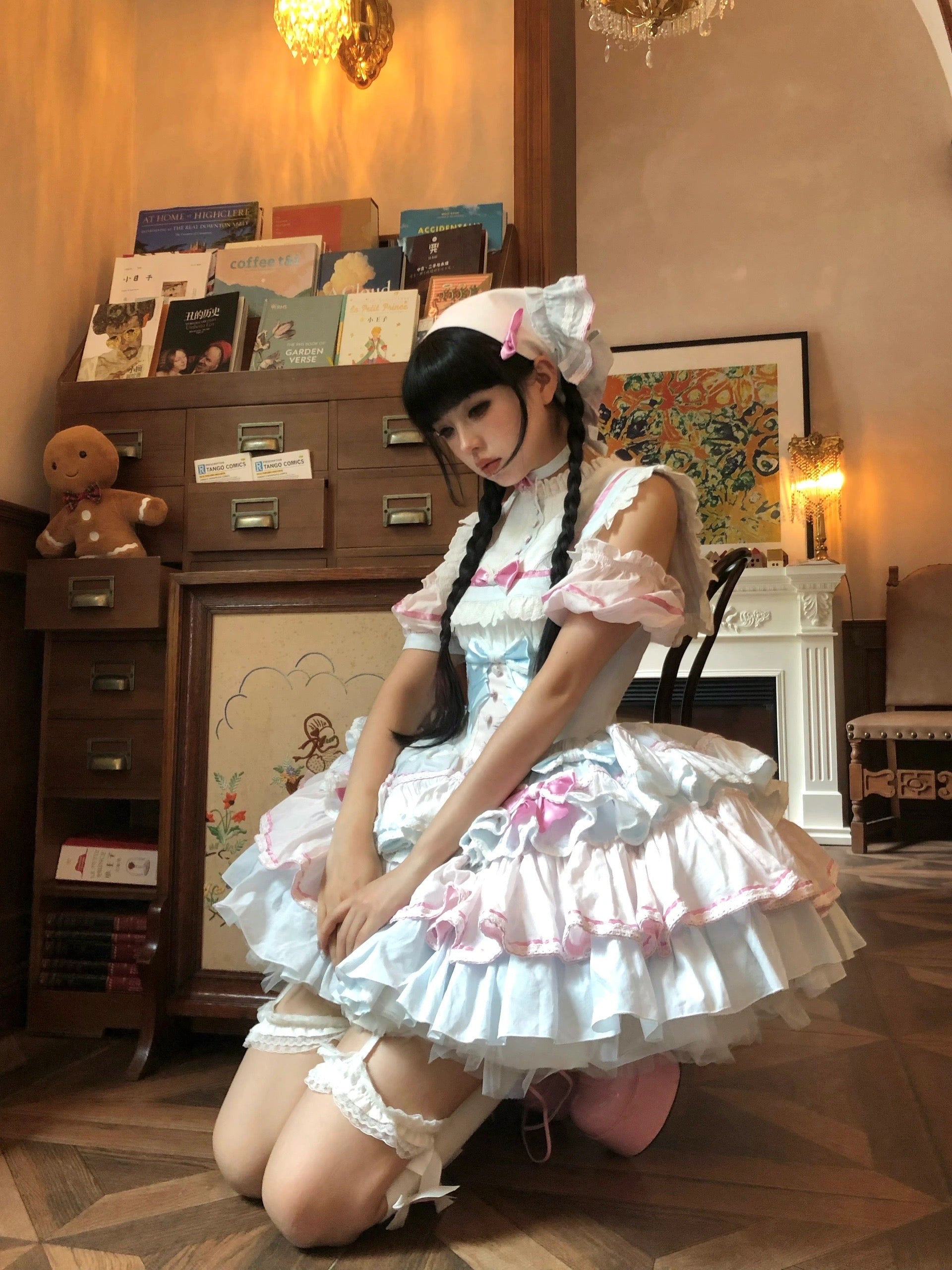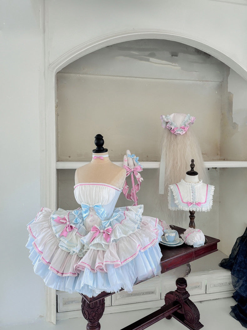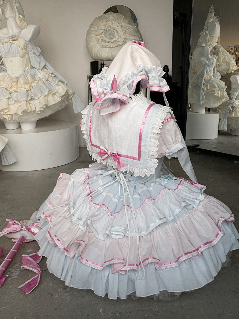 青と白のオールドスクールロリータファッションドレス 蝶結びディテール JSK セット